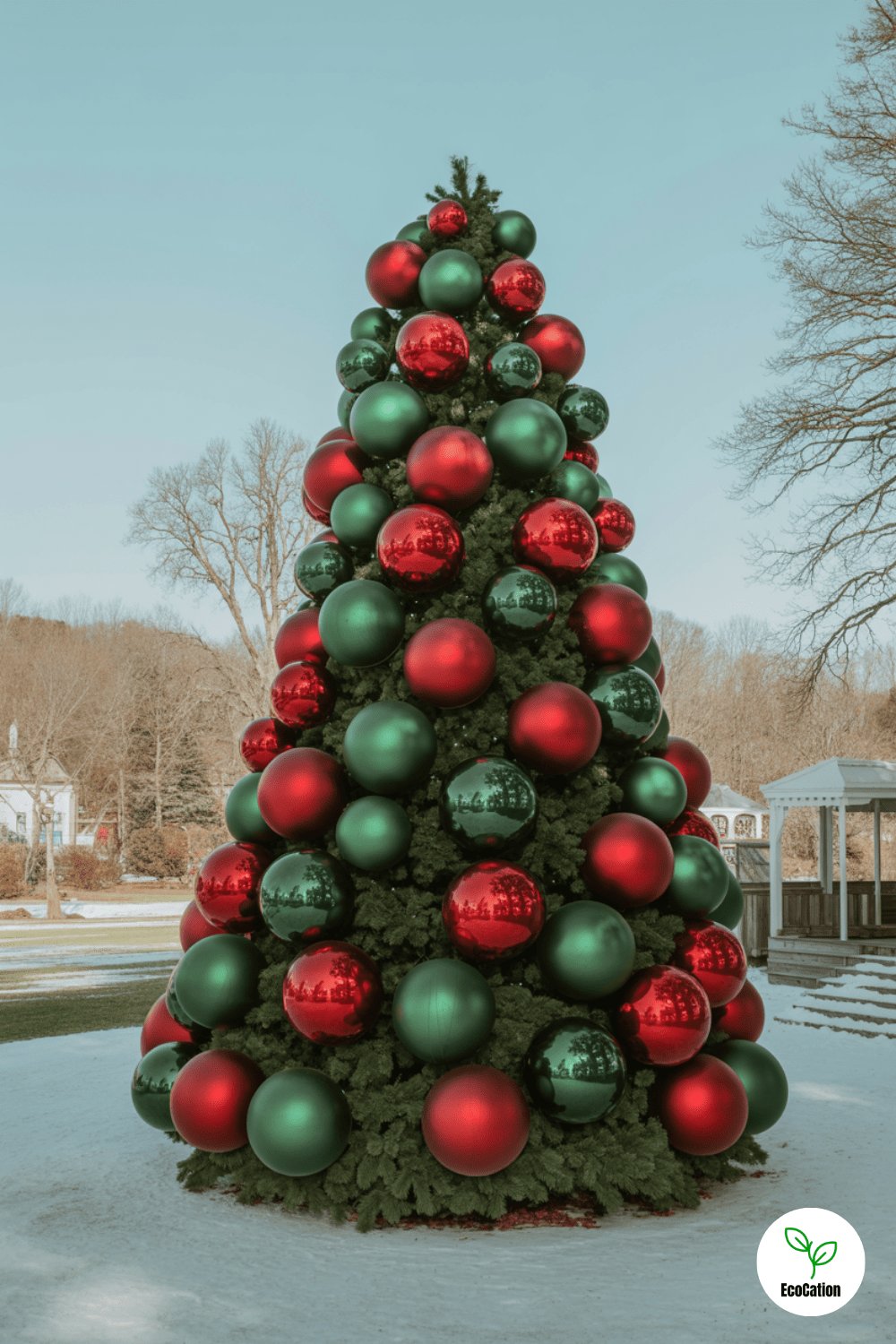 Make your outside Christmas tree a stunning focal point by contrasting the natural green of the evergreen with deep, rich jewel tones. Choose extra-large, shatterproof ornaments in vibrant reds, deep greens, and maybe a touch of sapphire or amethyst. These colors truly pop against a snowy winter backdrop, giving your display maximum visual impact.