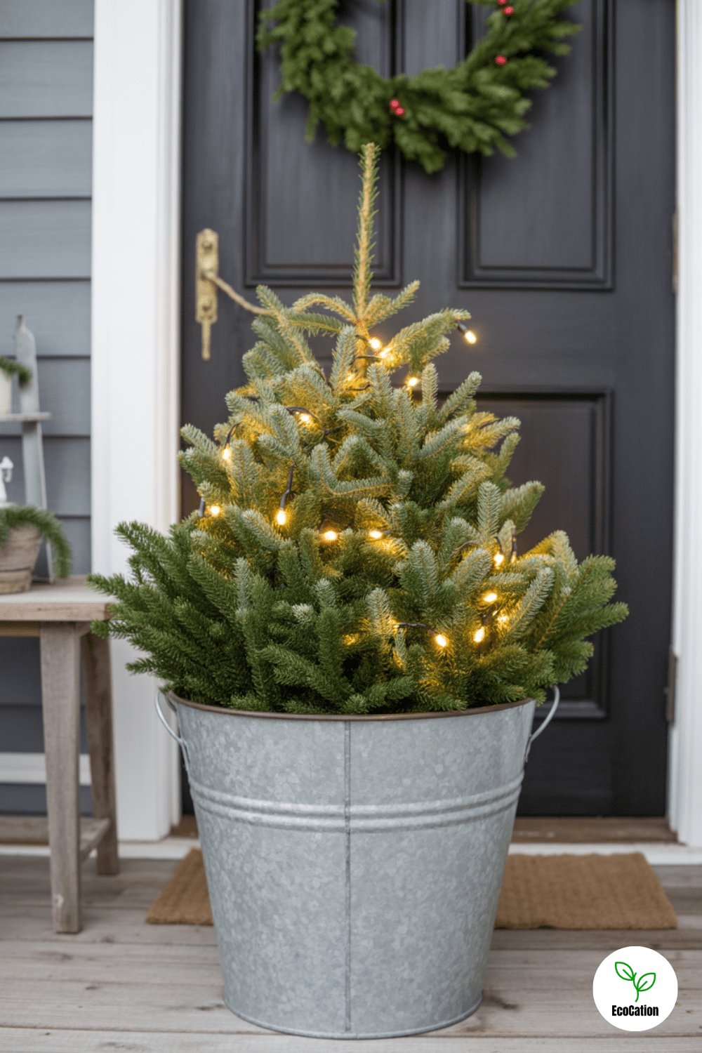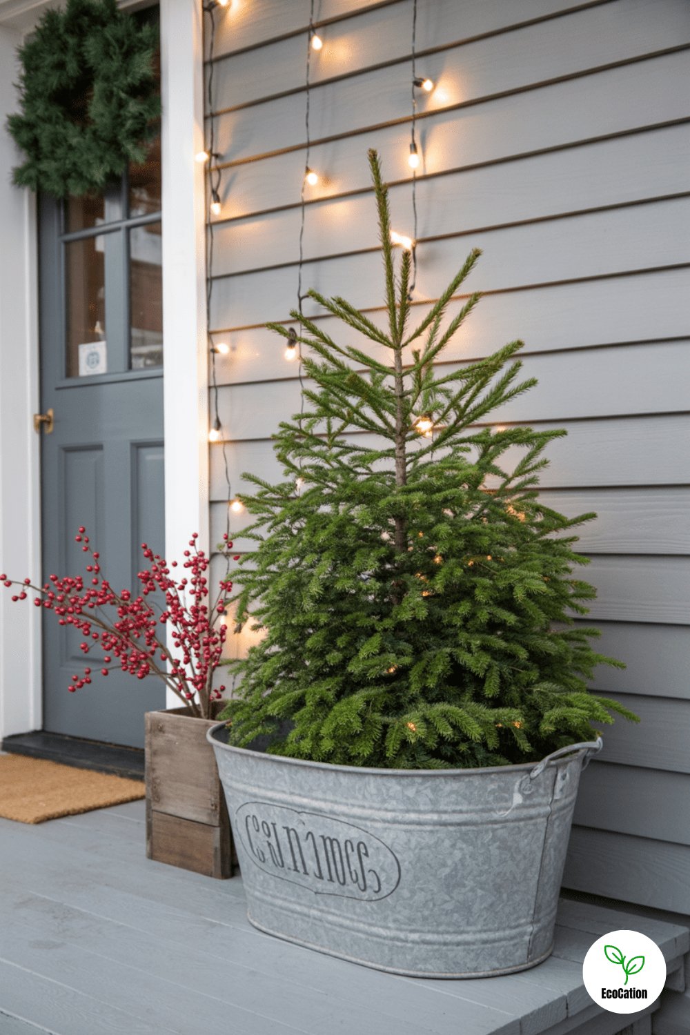 For a quaint and welcoming porch display, pot your small evergreen in a charming vintage galvanized wash tub. This rustic look is easy to complete with simple red berry sprigs and a string of soft Christmas lights. It s a perfect mix of cozy, countrified appeal and festive holiday cheer.