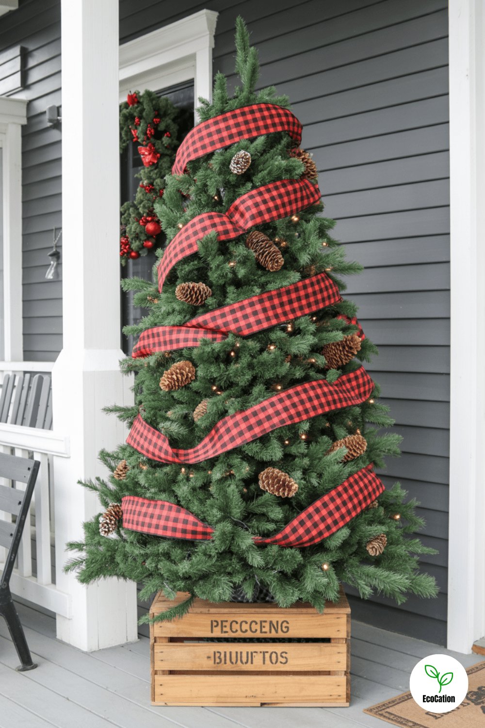 Bring that cozy farmhouse aesthetic right to your front porch with a rustic outdoor tree display. Embrace natural textures like buffalo plaid ribbon, real or artificial pinecones, and simple white lights that perfectly complement a wooden crate base. This style is instantly welcoming and looks especially wonderful against wooden siding or a stone entryway.
