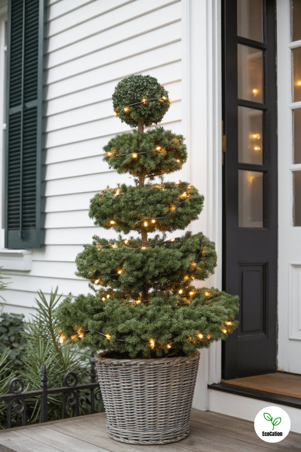For a formal, tailored look that feels like luxury Christmas decor, choose an evergreen trimmed into a neat, classic topiary shape. The neat form is best highlighted by wrapping it tightly in tiny white outdoor lights. This offers a polished, structured piece of decor that is perfect for a sophisticated entry or porch.