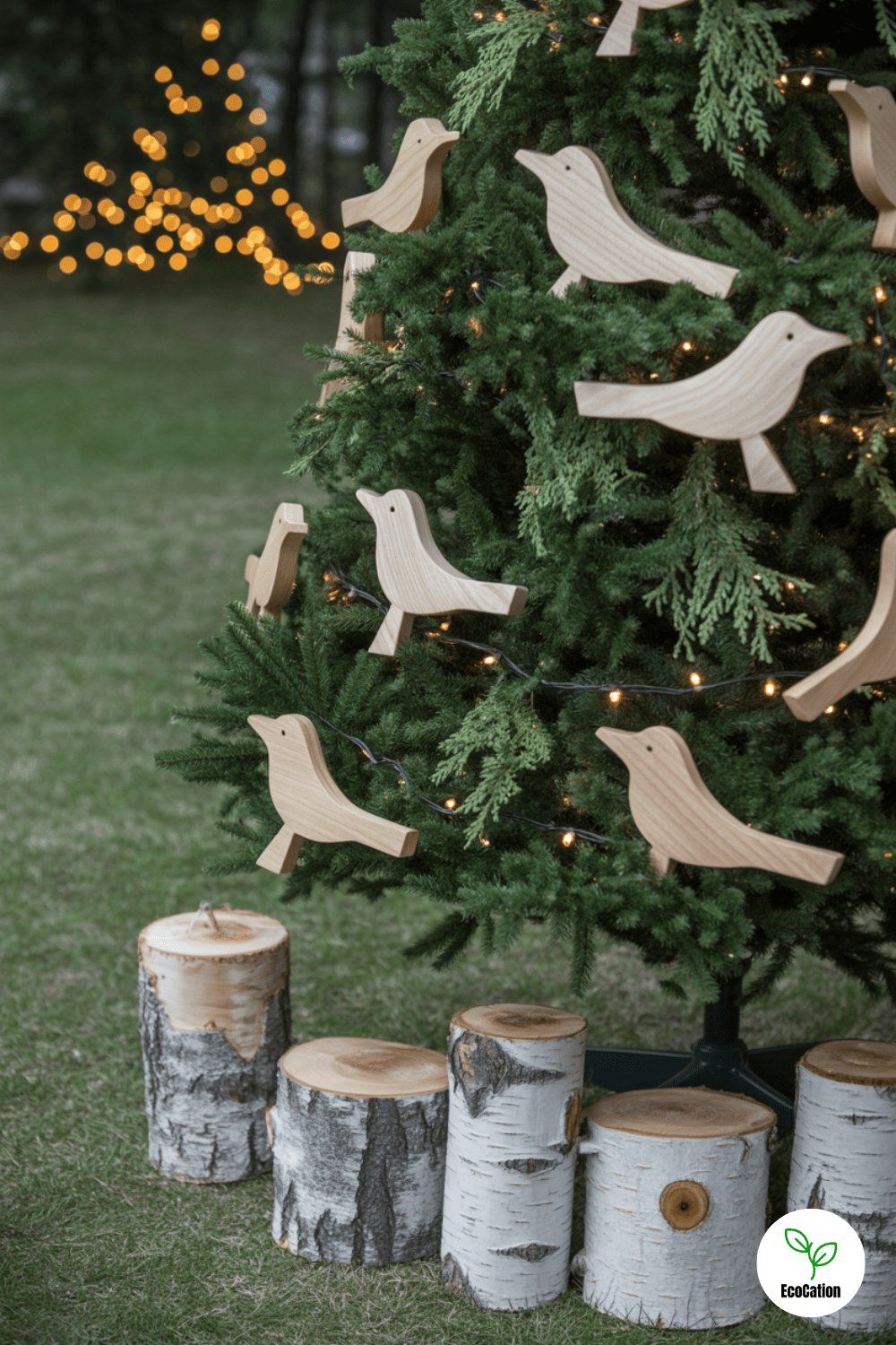 Embrace a natural, cozy theme by decorating your tree with elements straight from the outdoors. Adorn it with wooden bird ornaments, small bundles of birch logs at the base, and warm white lights to create a display that blends beautifully into a natural, wooded setting. This look feels effortlessly charming and deeply connected to the winter landscape.