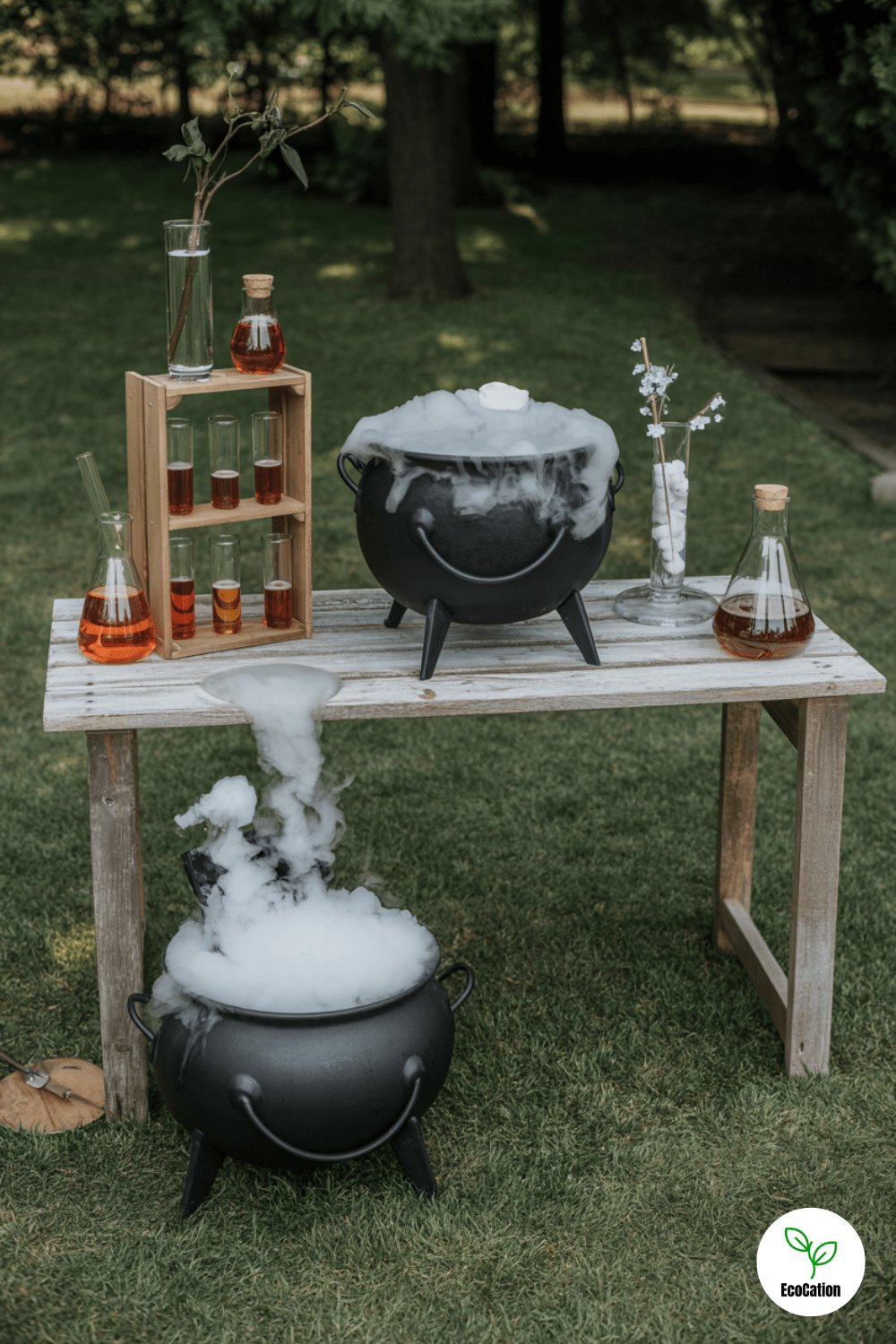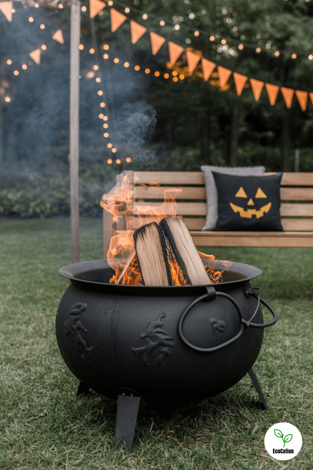 Style your fire pit to resemble a giant black cauldron bubbling with smoke. Not only does it keep your guests warm, but it also becomes the dramatic centerpiece of your setup. Toss in some scented wood for a cozy autumn aroma that adds to the experience.