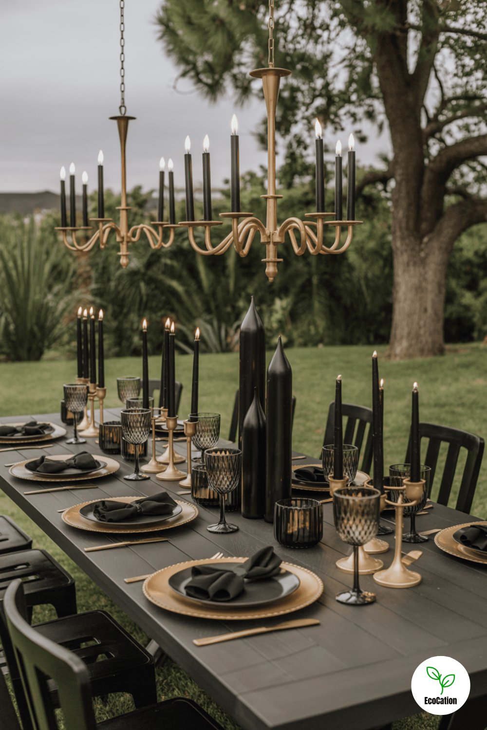 Set up a table with black linens, gold candleholders, and chandeliers to create a glamorous Halloween scene. This style is perfect for dinner parties where you want a mix of spooky and sophistication. Keep the food served in golden bowls or trays to match the theme seamlessly.
