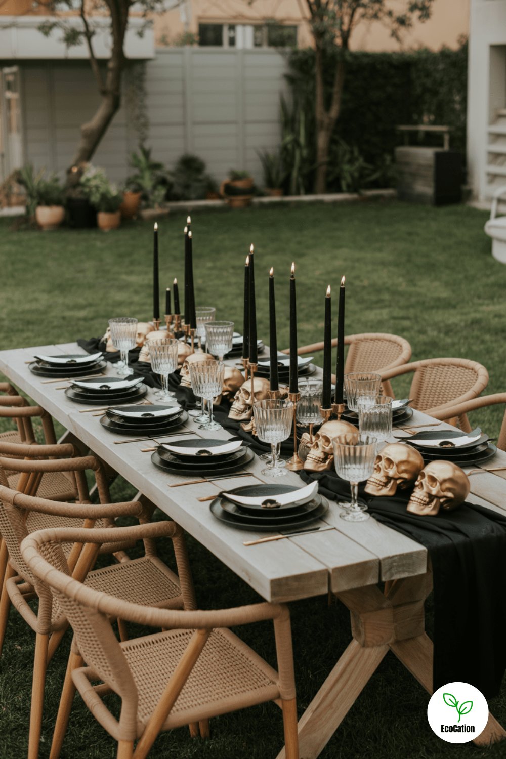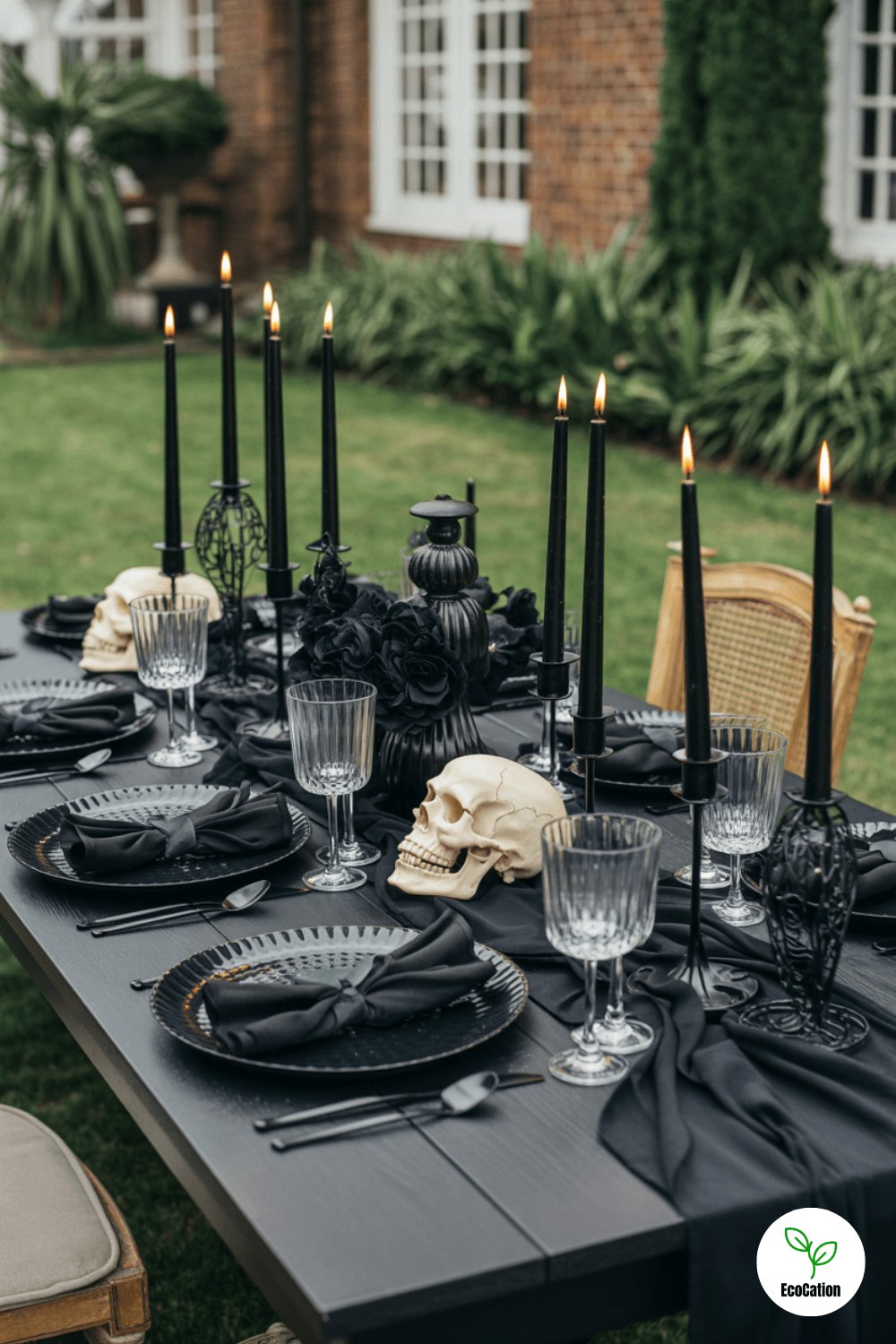 Dress a table in deep black linens and adorn it with skull centerpieces and gothic candleholders for a classy vibe. This setup works best if you keep the color scheme tight black, silver, and deep red are winners. Scatter faux cobwebs for texture and dim the lighting for dramatic effect.