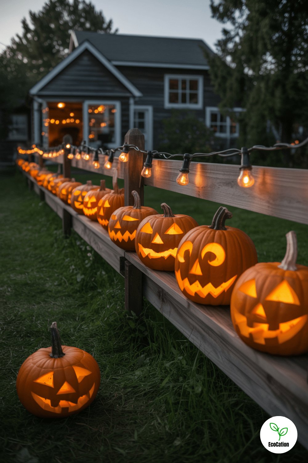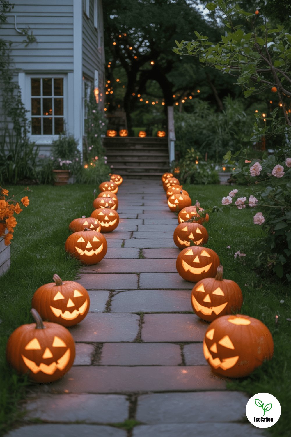 Line your garden walkway with glowing pumpkin lanterns to set a magical tone from the very start. Mix in real and faux pumpkins so you can prep ahead of time without the worry of carving all at once. For added flair, tuck battery-powered lights inside to keep things safe and glowing all night.