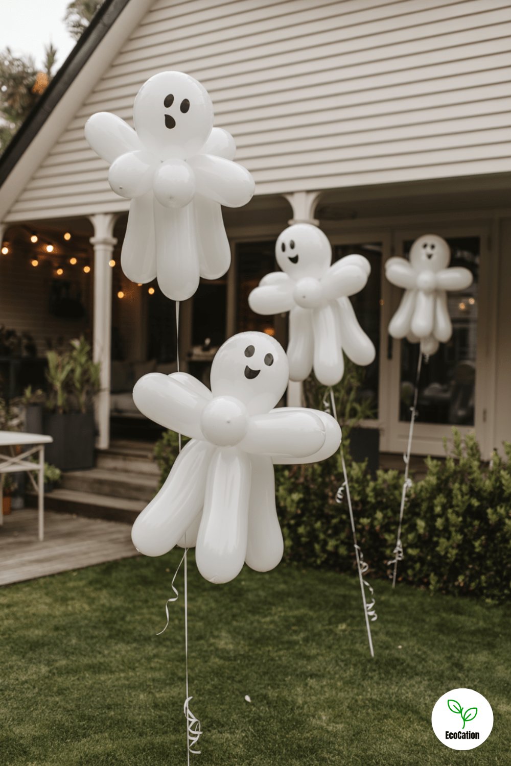 Tie white balloon ghosts to garden posts and let them float eerily in the breeze. Draw simple faces with a marker, then drape them in lightweight fabric for movement. These are easy, budget-friendly decorations that add both charm and chills to your party setting.