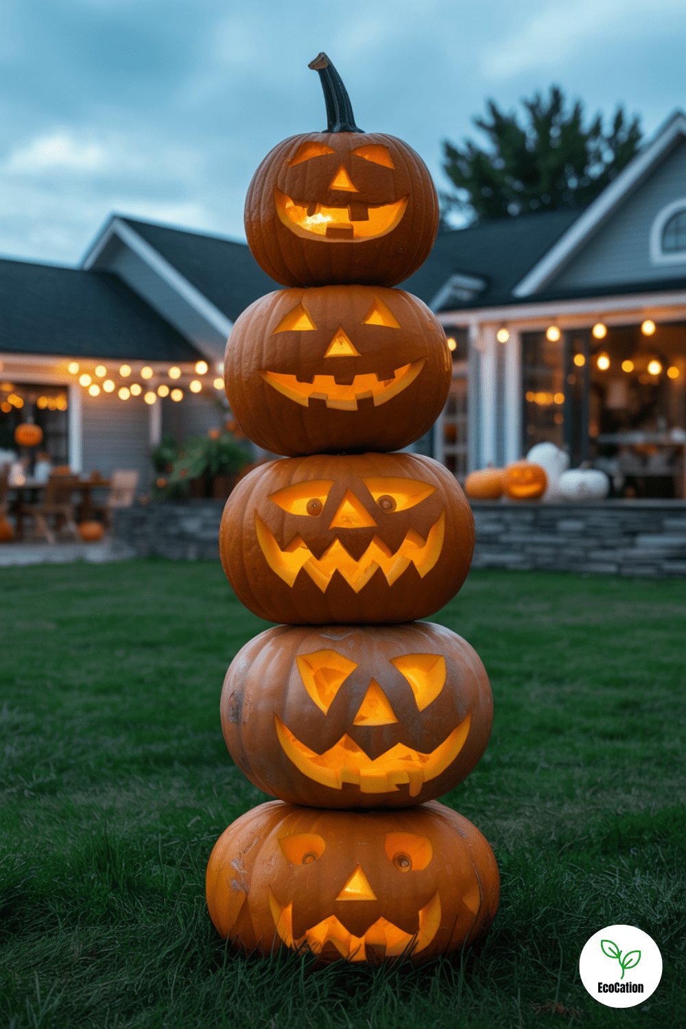 Stack carved pumpkins into a glowing tower to create a dramatic centerpiece in your yard. This idea doubles as both decoration and lighting. Secure each layer with wooden dowels or stakes so the tower stays safe and sturdy all evening.