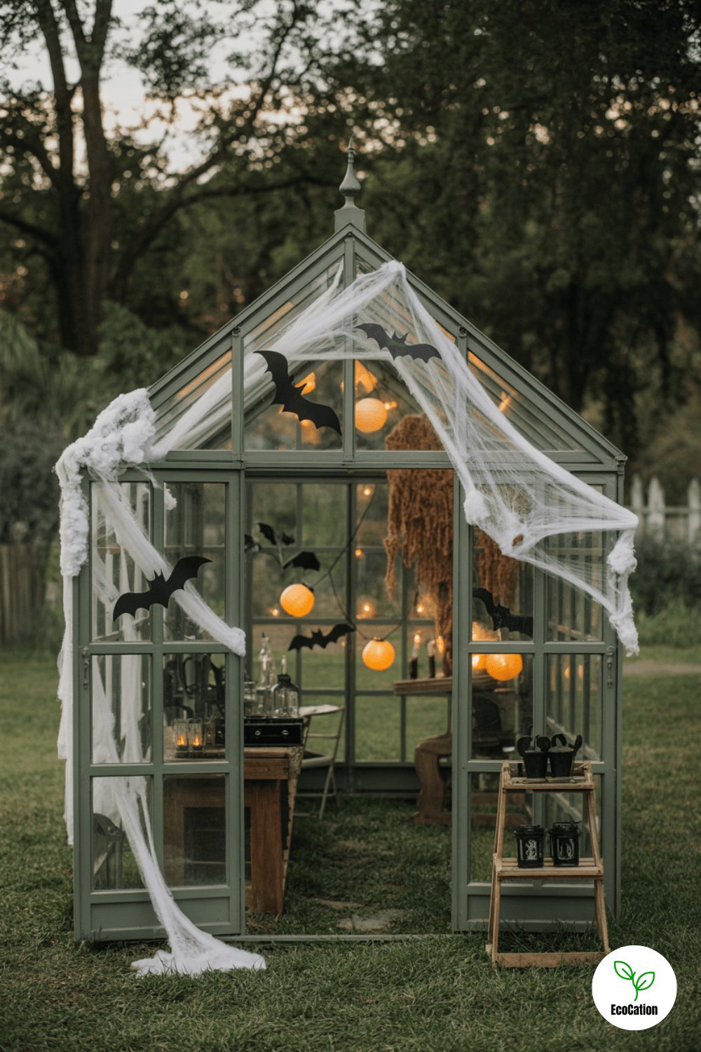 Turn a glass greenhouse into your haunting centerpiece by draping cobwebs, hanging bats, and scattering flickering lanterns. The transparent walls make shadows dance, which ups the spooky factor at night. Keep a fog machine nearby to let wisps of mist curl out the door for a chilling touch.