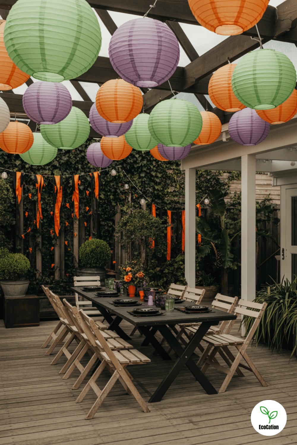 Fill your patio with lanterns in green, orange, and purple to cast a festive, eerie glow. Mix and match styles some tall, some hanging for layers of light. Battery-powered options make setup easier and let you place them safely anywhere without worrying about fire hazards.