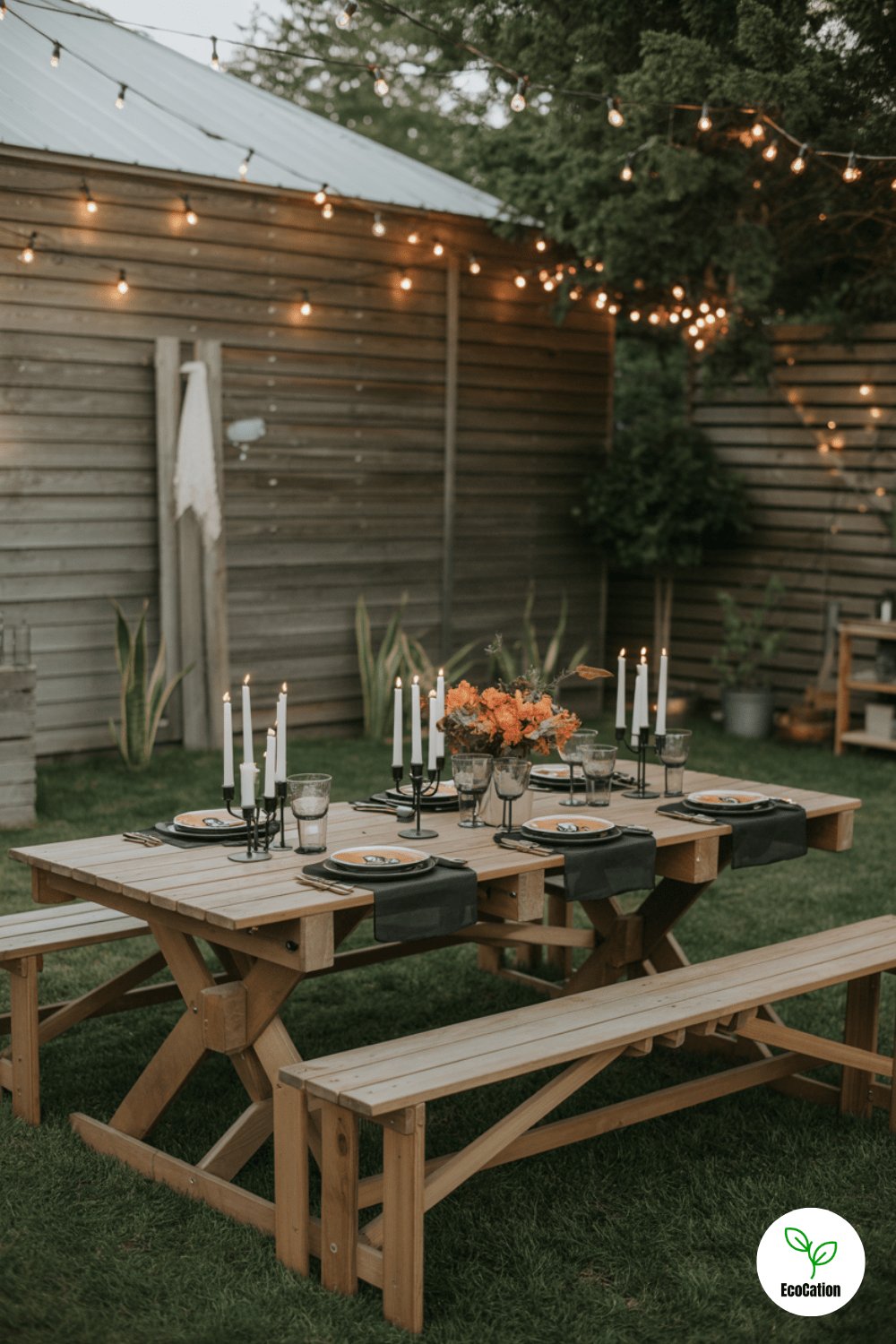 Rustic wooden tables paired with string lights create an inviting, warm backdrop for your spooky celebration. Add eerie candleholders for just the right amount of haunting charm. Keep the table decor simple with autumn leaves and dark linens so your guests feel cozy while still in the Halloween spirit.