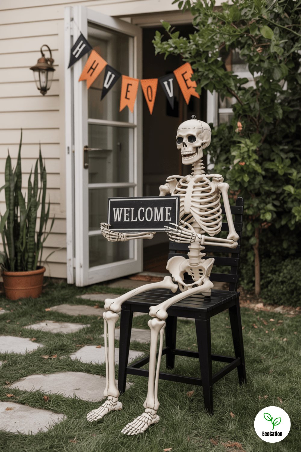Place a life-size skeleton at the entrance with a quirky welcome sign to greet your guests. It sets a playful tone and makes a perfect first photo opportunity. Dress the skeleton in a cape or hat to give it extra personality guests will love snapping selfies with their spooky host.