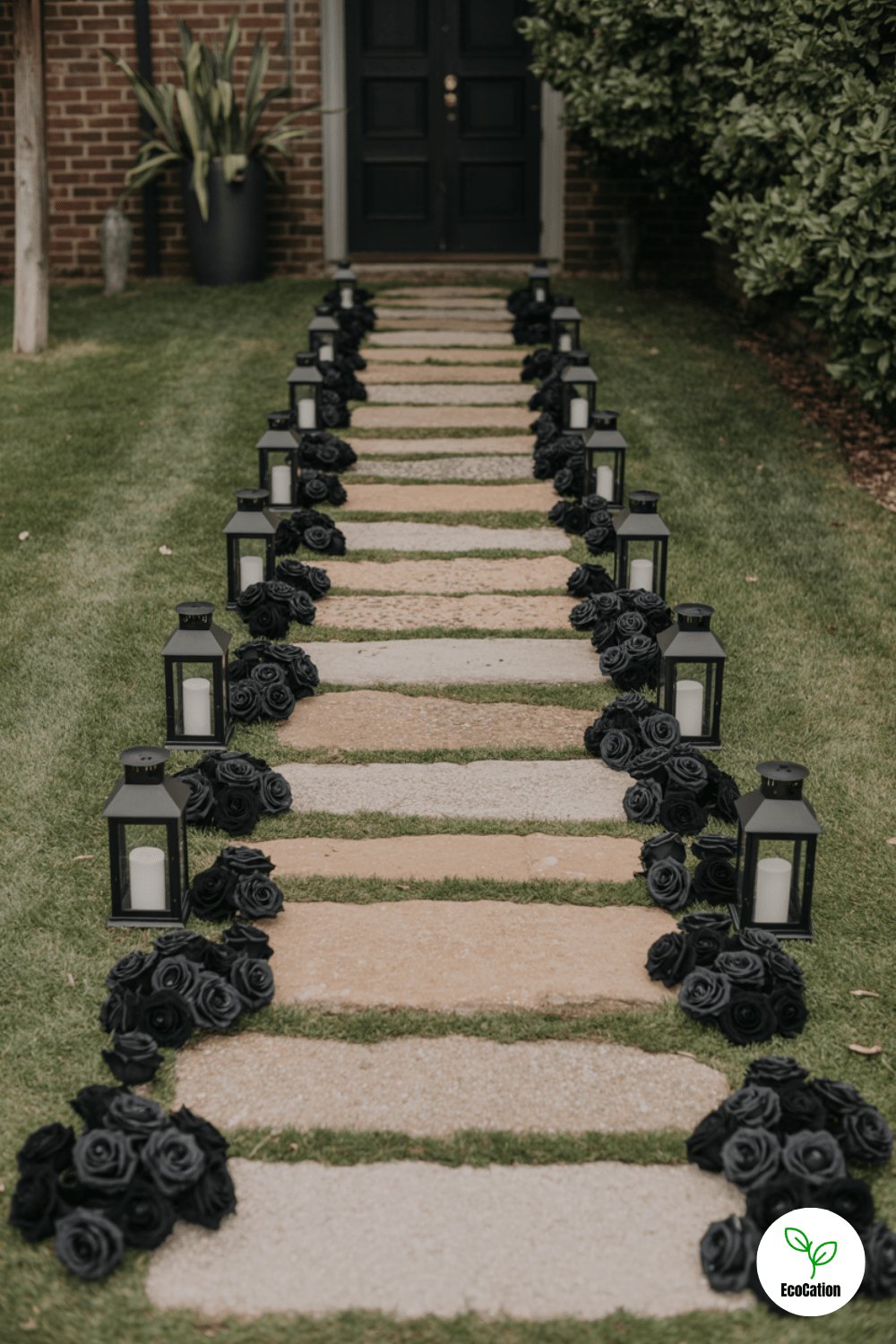 Line your garden path with black roses and lanterns for a touch of dark elegance. The combination is eerie yet romantic, perfect for guiding guests deeper into the party space. Use solar lanterns for hassle-free lighting that lasts throughout the night.