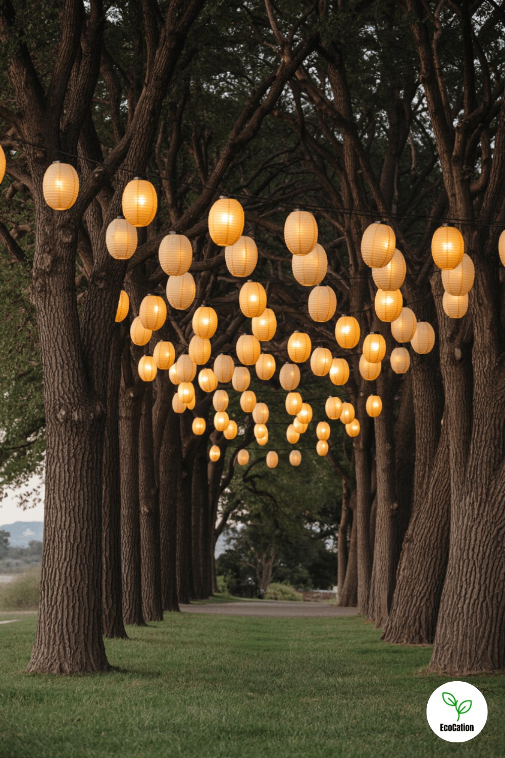 Hang dozens of lanterns in warm autumn tones throughout a grove of trees for a magical effect. The soft light transforms your backyard into a glowing forest. Mix in both hanging and ground lanterns to layer the ambiance.