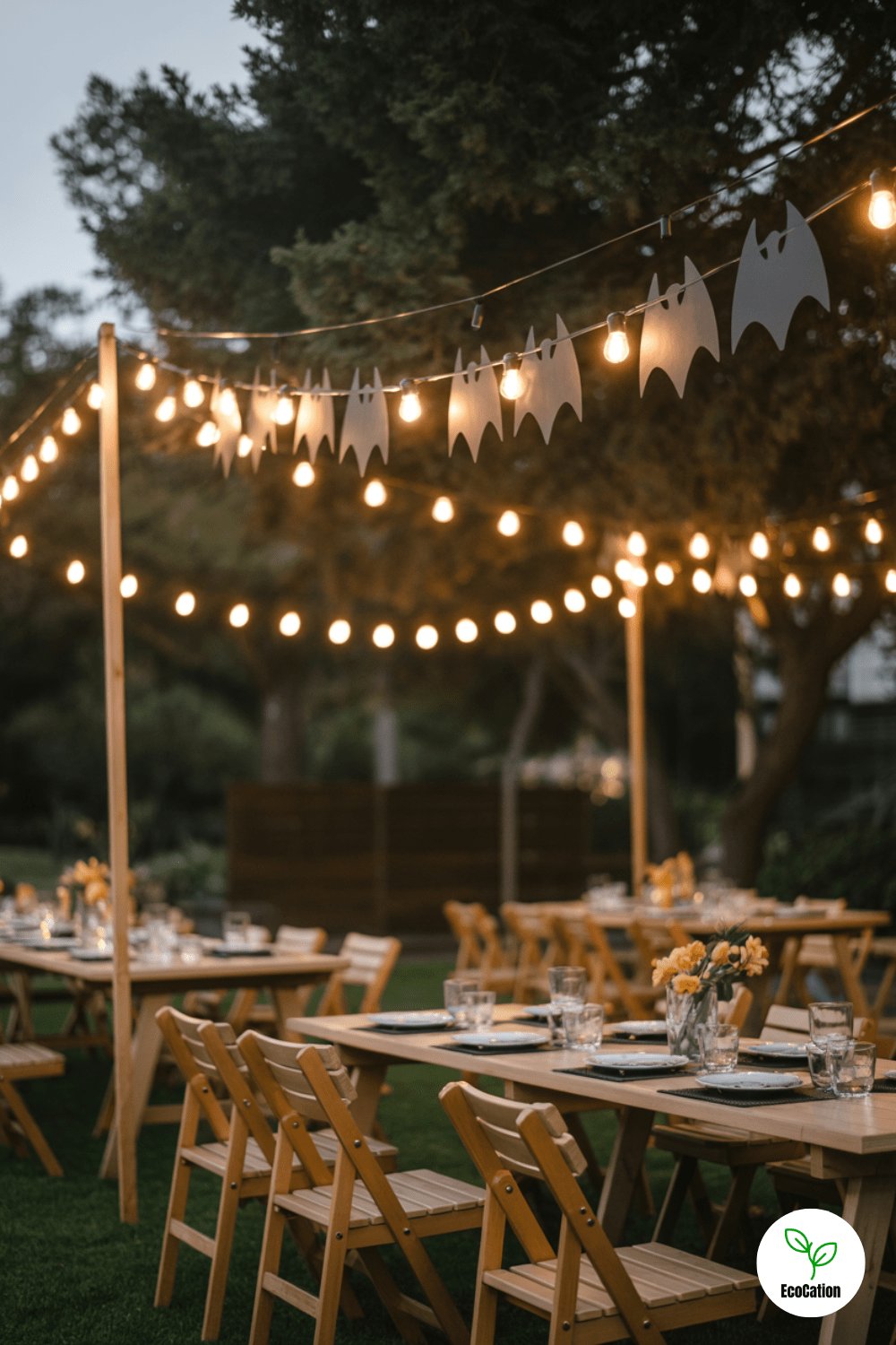 Hang bat-shaped string lights above your seating area to create a festive canopy. The playful silhouettes fluttering above add both light and atmosphere. Pair them with darker seating cushions or throws to keep the focus upward and highlight the Halloween vibe.