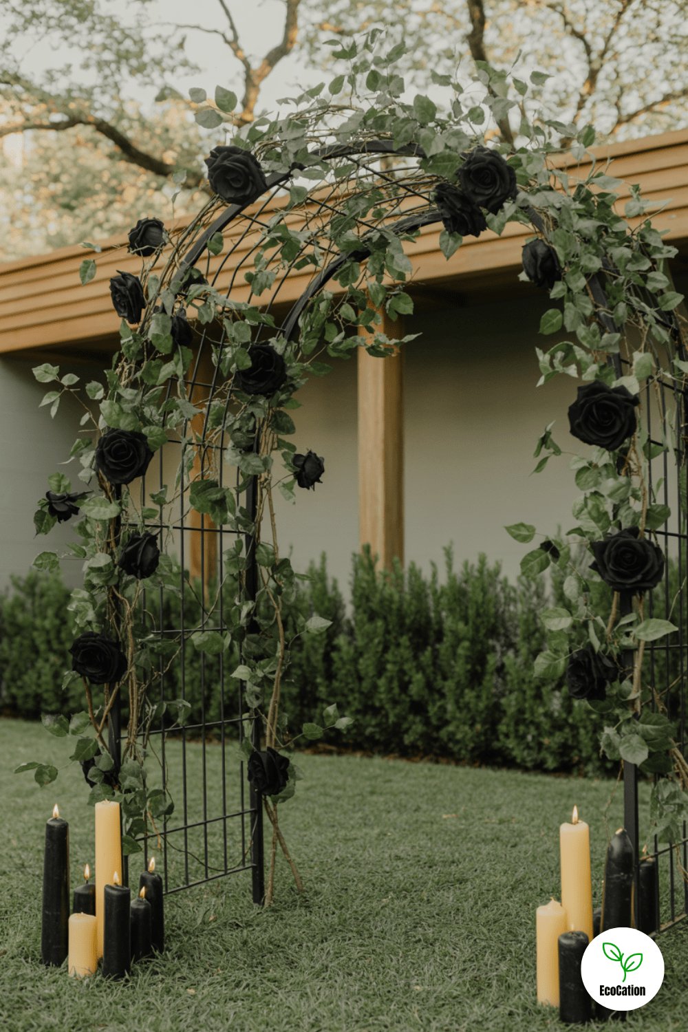 Decorate a vine-covered archway with black roses and candles to create a dramatic entrance. The contrast between the natural greenery and dark blooms makes a stunning first impression. For safety, use LED candles so the whole setup stays glowing without worry.