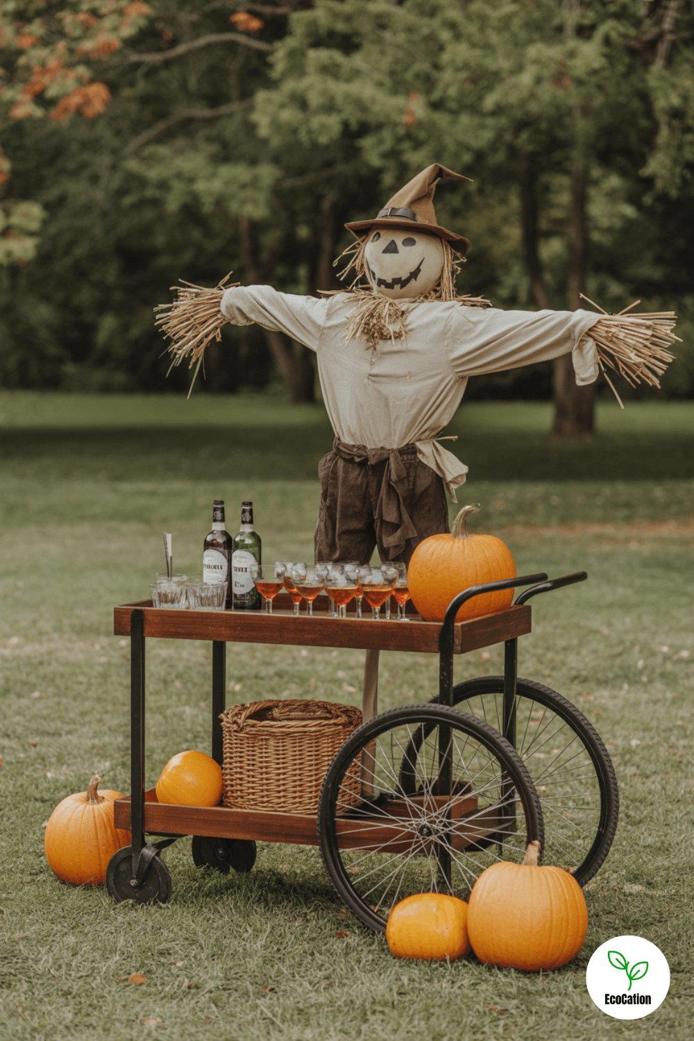 Station a rustic scarecrow by your bar cart filled with Halloween cocktails. Give the scarecrow a witch s hat or glowing eyes for a fun twist. Guests will love the quirky photo opportunity while grabbing their drinks.