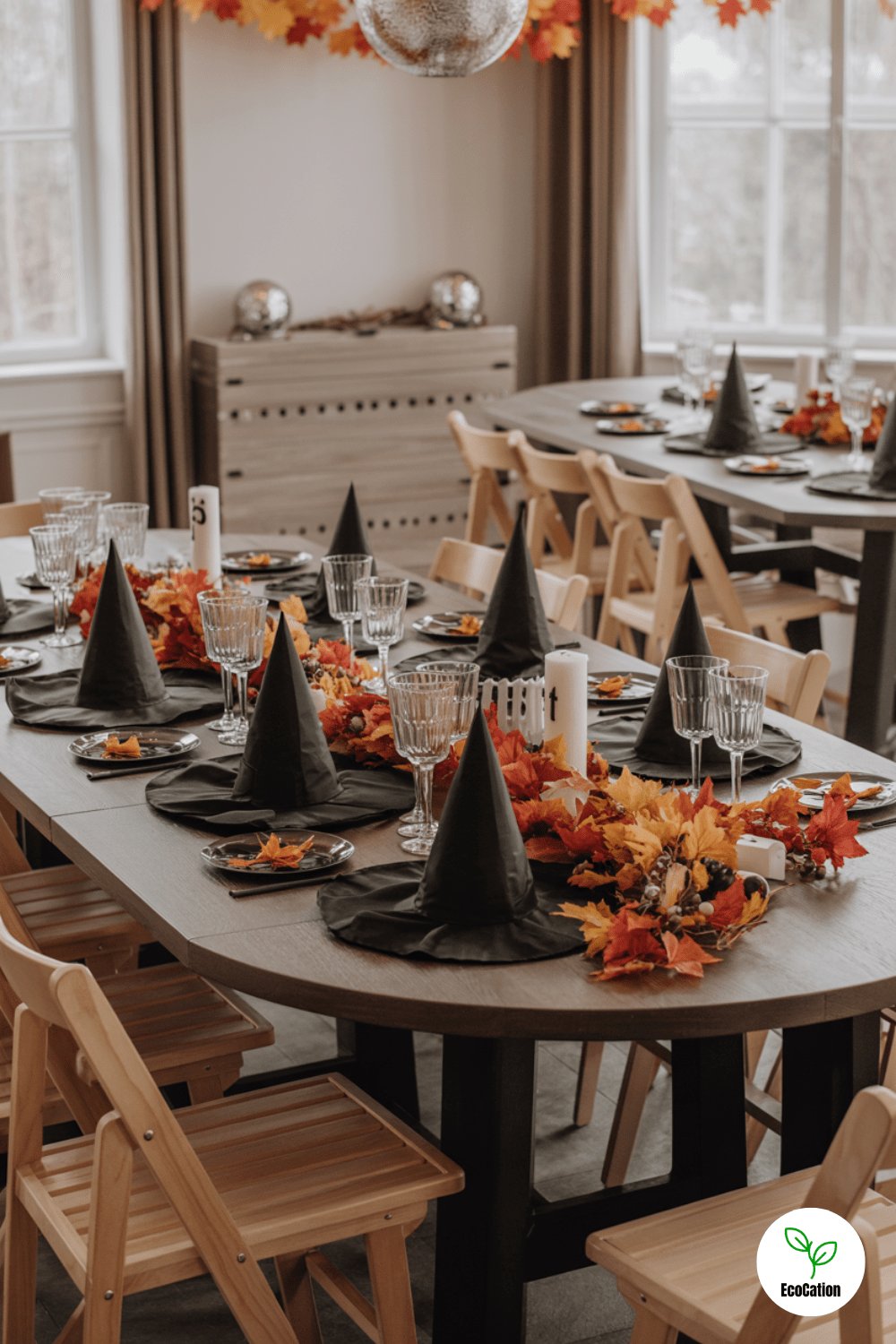 Turn witch hats into clever centerpieces by filling them with flowers, leaves, or candy. Round tables decorated this way feel whimsical but still adult-friendly. A little glitter spray or a touch of orange ribbon can take them from simple to stylish without much effort.