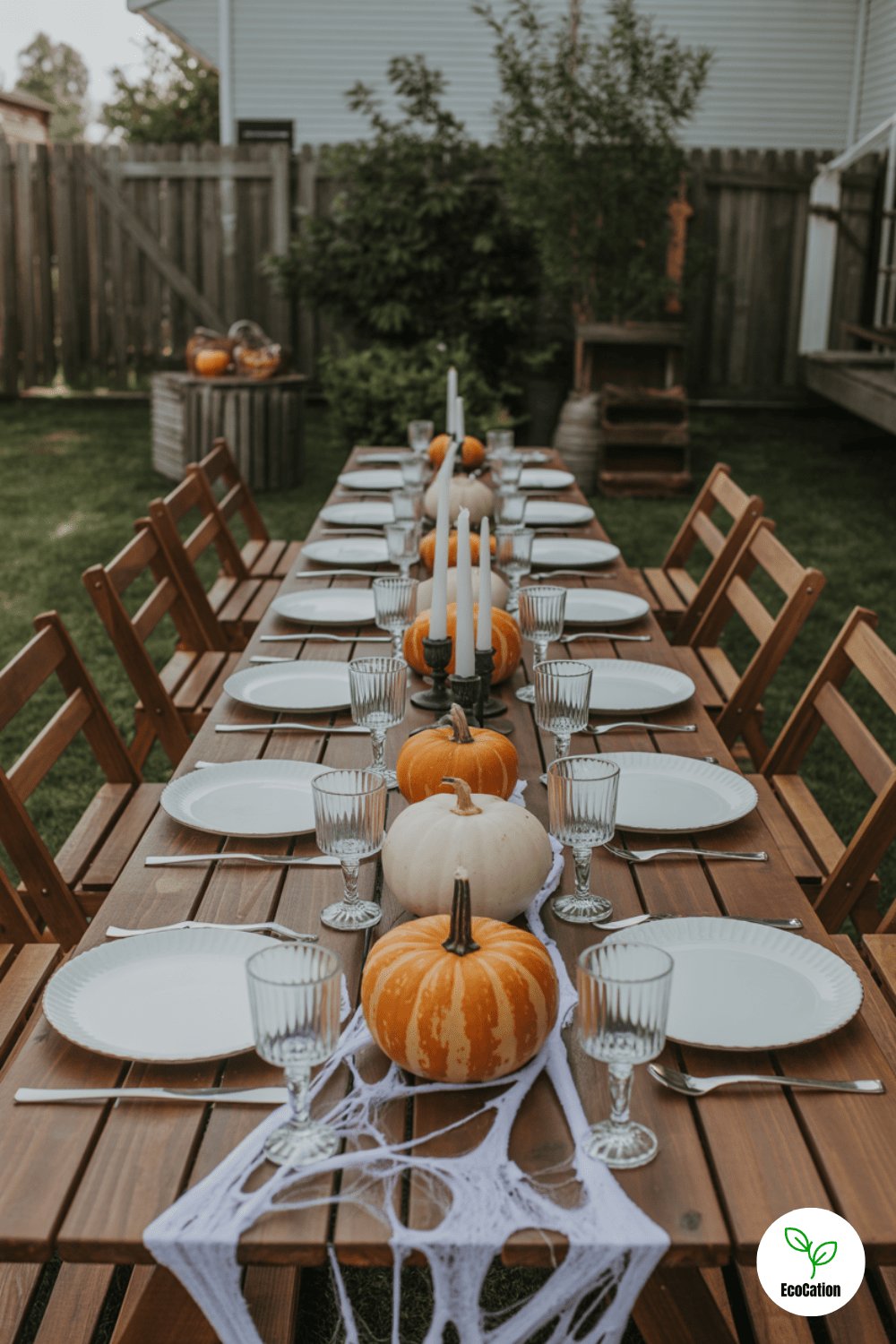 Style a long wooden table with cobweb runners, pumpkins, and candleholders for a cozy yet eerie look. This setup is easy to recreate with everyday fall decorations. Add a few scattered candy bowls to keep guests snacking while mingling.
