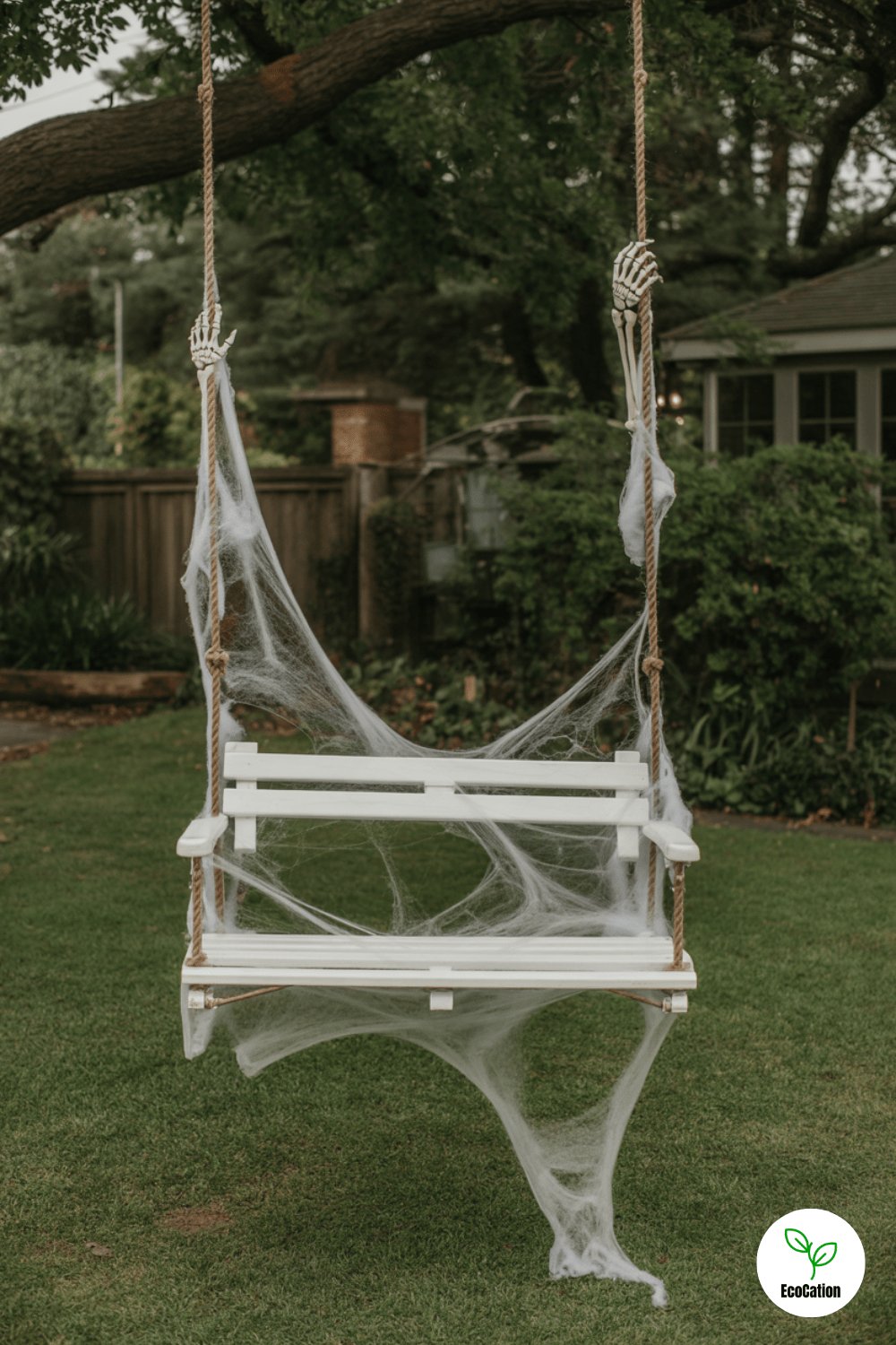 Transform a garden swing into a chilling photo backdrop by draping it with cobwebs and adding skeleton hands. Guests will flock to it for spooky snapshots. For extra drama, spotlight the swing so it glows after sunset.
