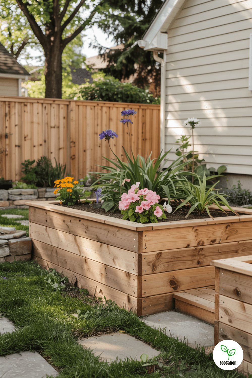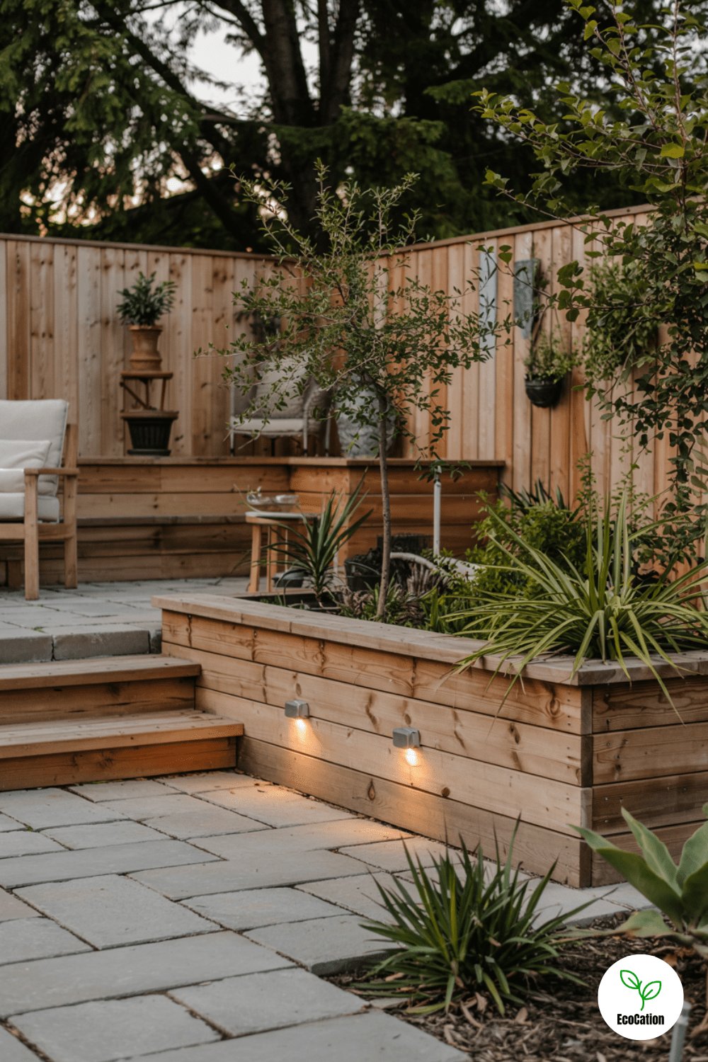 A tall timber wall creates a raised patio area ideal for uneven yards. Embed solar-powered lights into the structure for evening charm without wiring hassles.
