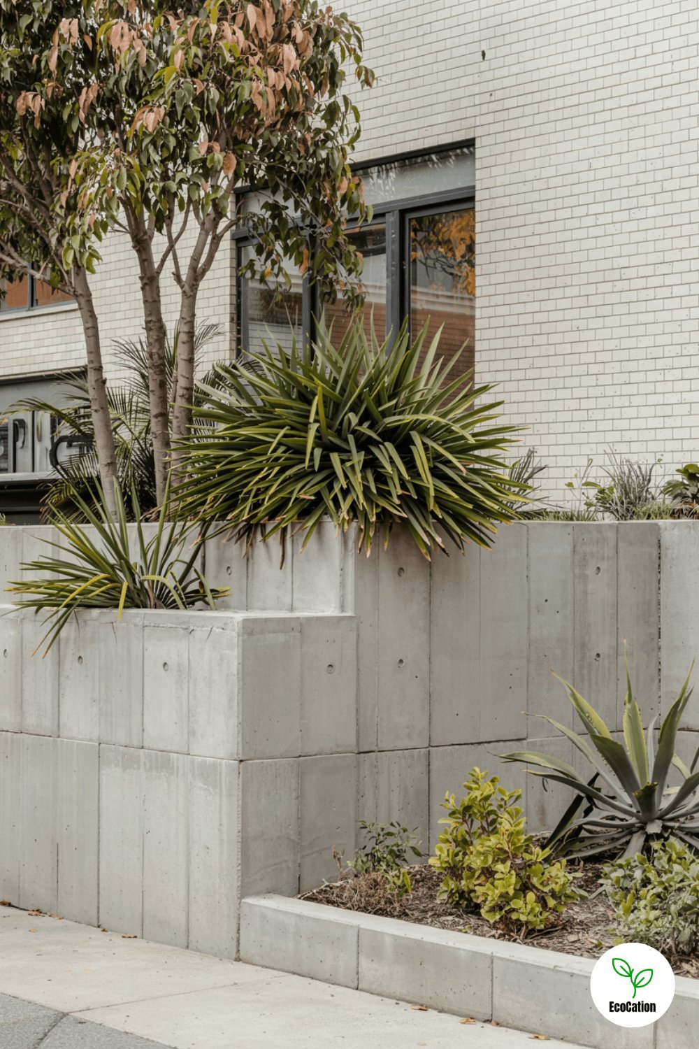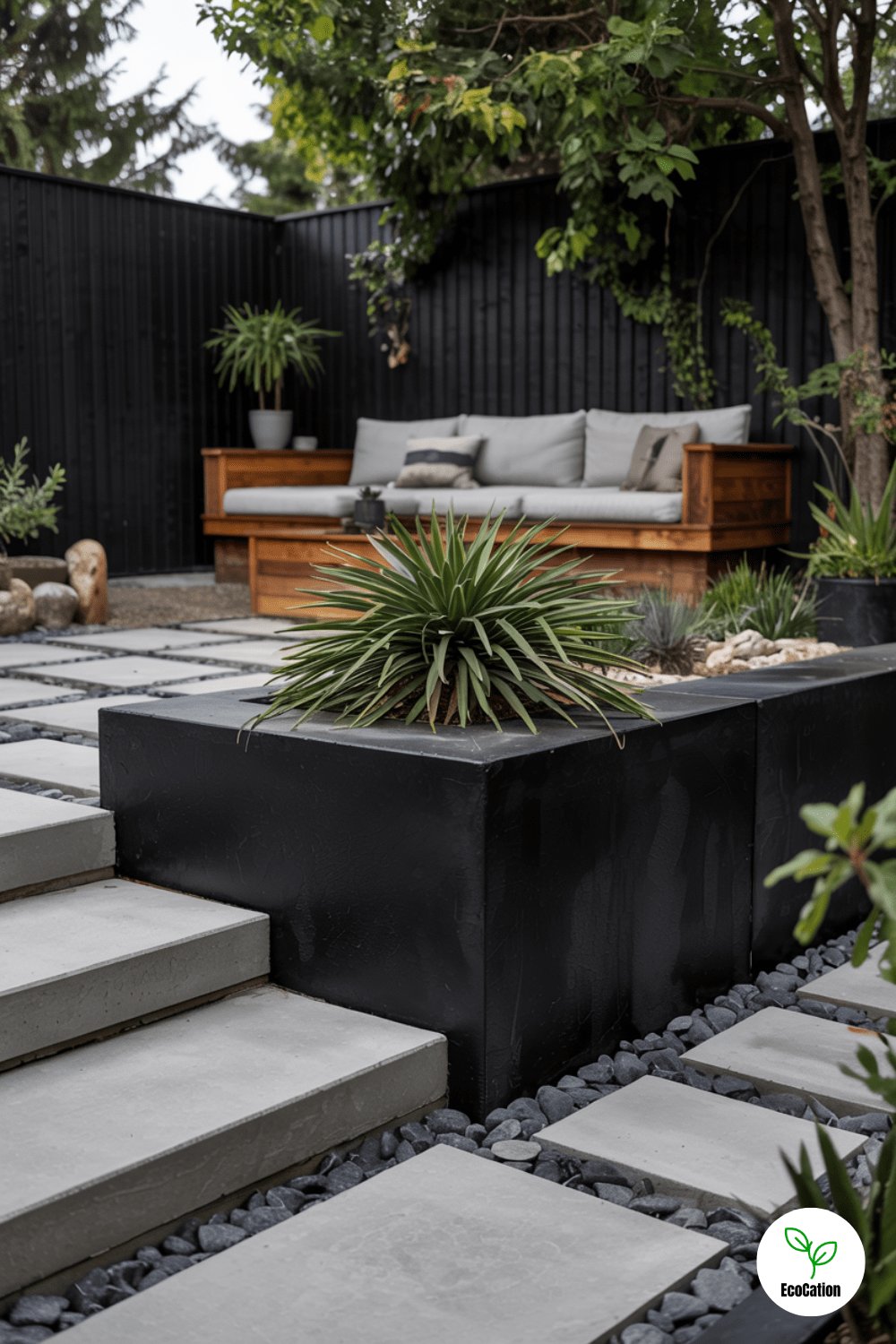 A matte black concrete wall makes a striking backdrop for minimalist landscapes. Contrast with white gravel or bright foliage for maximum impact. The dark hue also hides dirt and stains effortlessly.