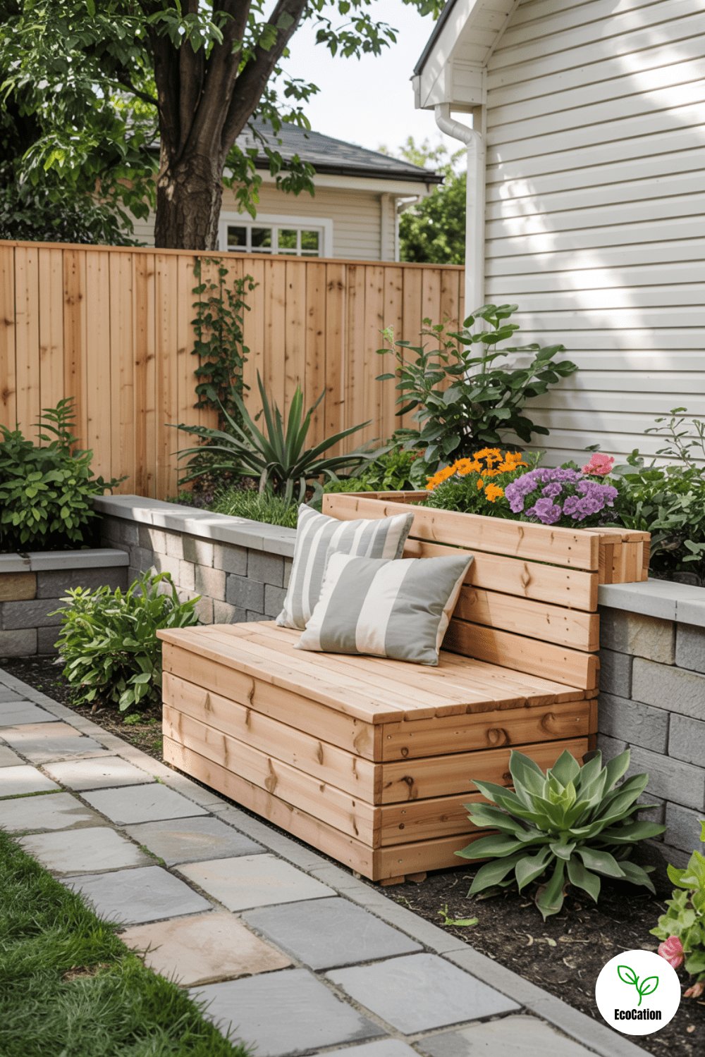 A retaining wall with a lift-up wooden bench seat offers clever storage for tools or cushions. Use cedar or teak for weather resistance, and add comfy outdoor pillows for instant seating.