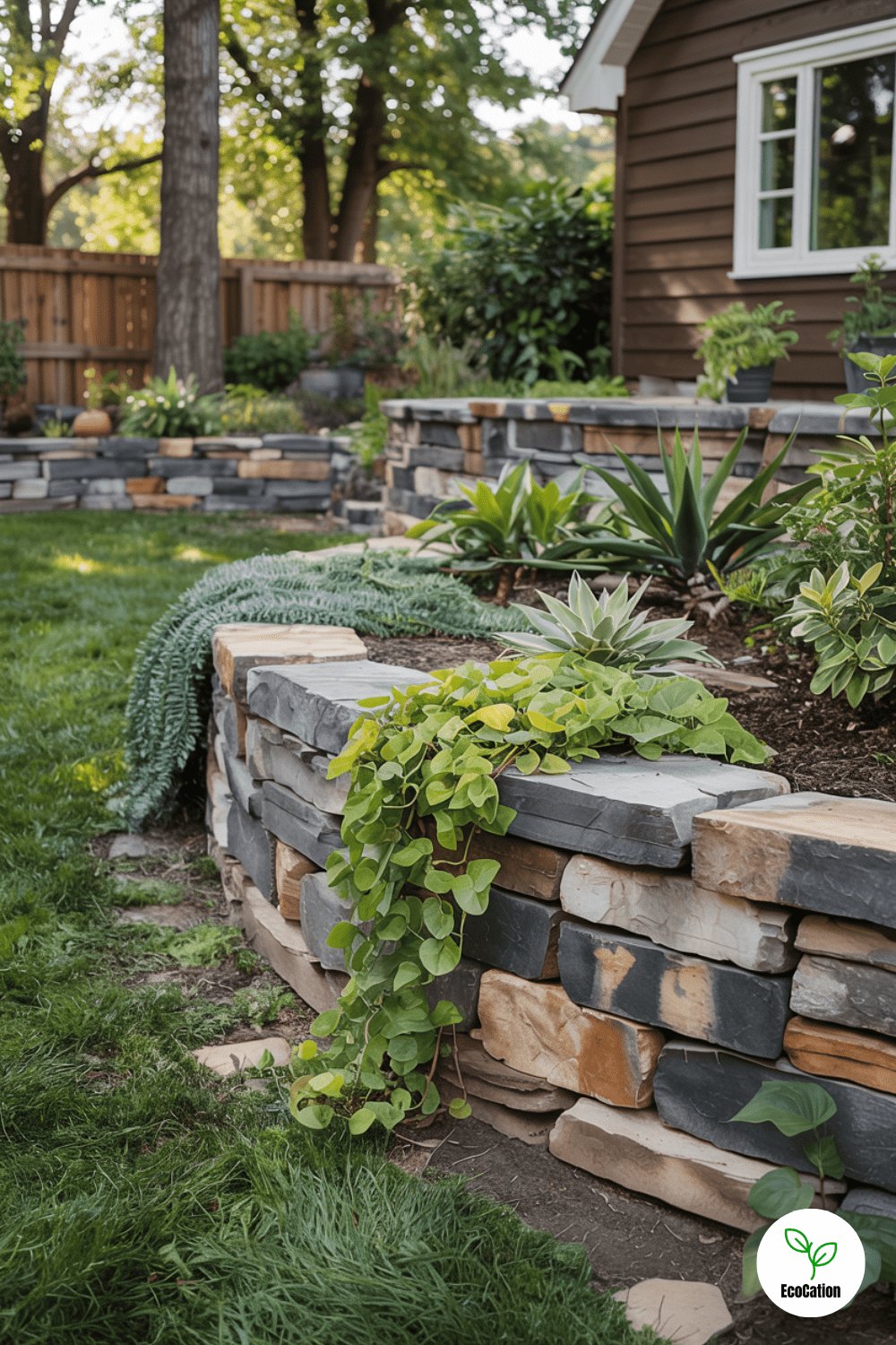 Layered natural stone walls break up a steep slope into manageable, beautiful tiers. Use larger stones at the base for stability, and fill gaps with creeping thyme for softness.