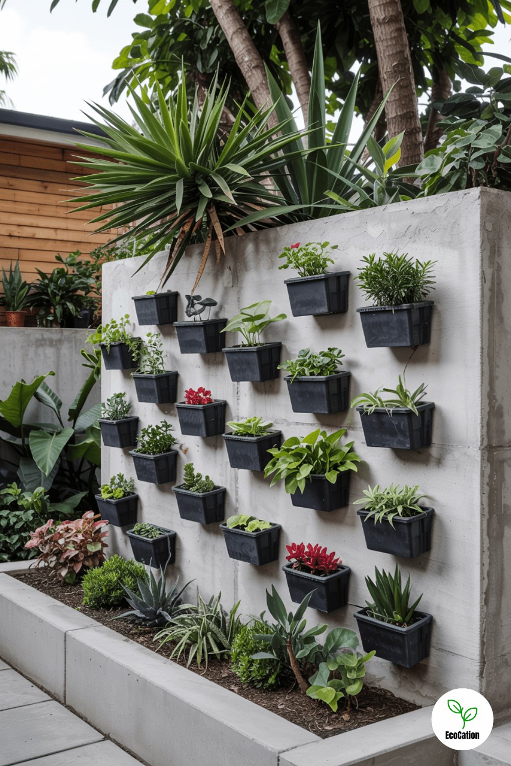 Mount plant pockets on a concrete wall for a living green facade. Herbs like mint or strawberries thrive here, saving ground space. Use drip irrigation for easy care.
