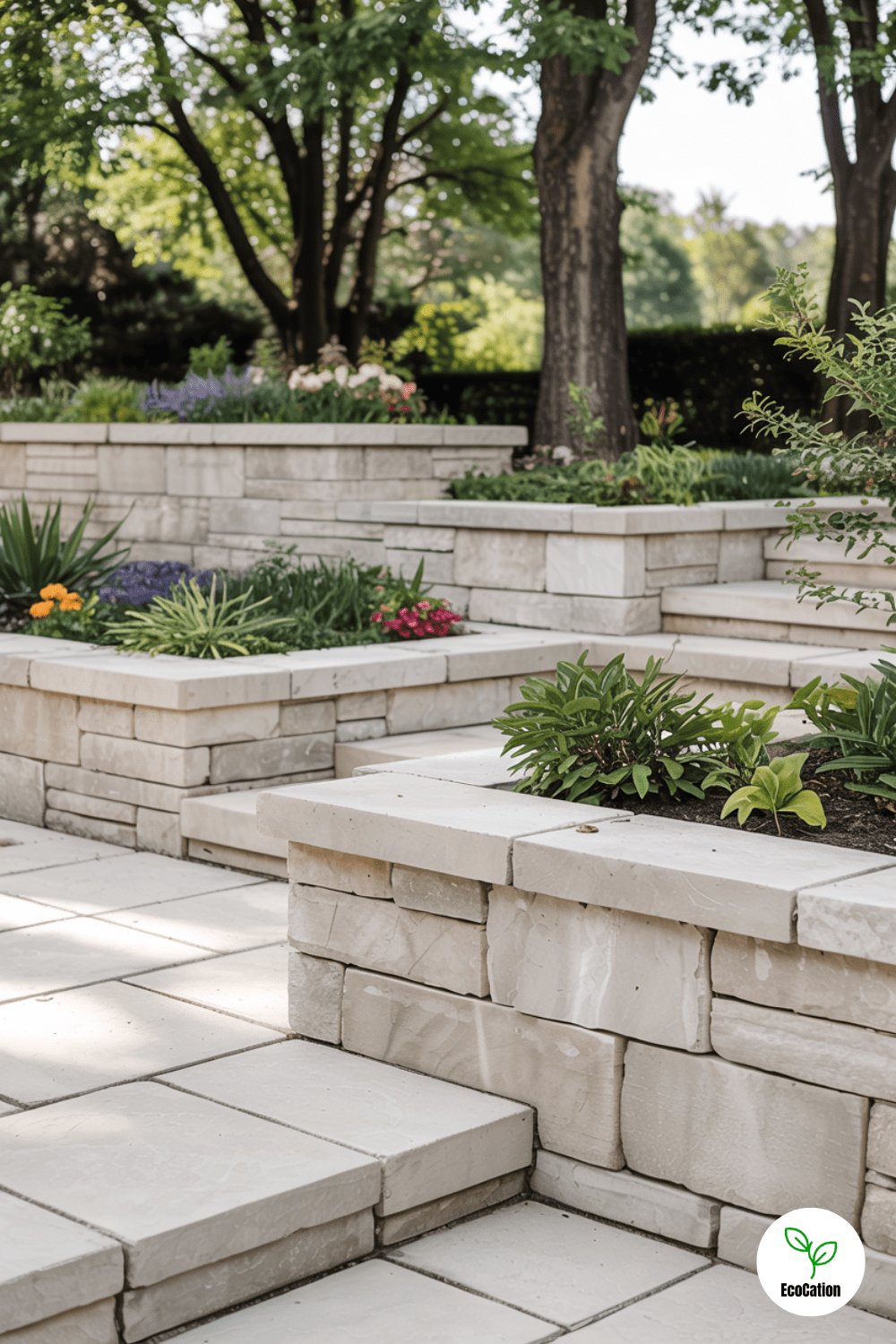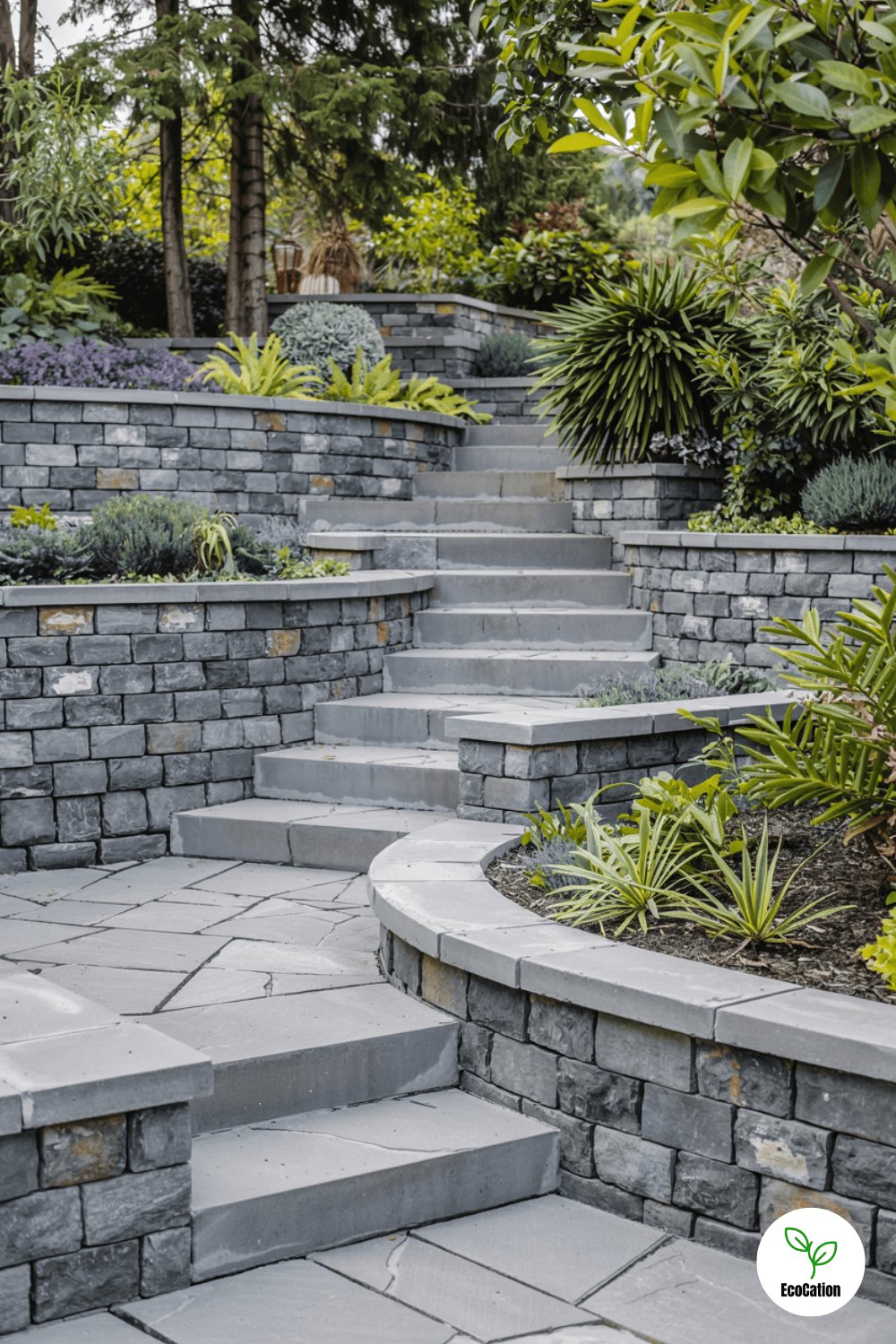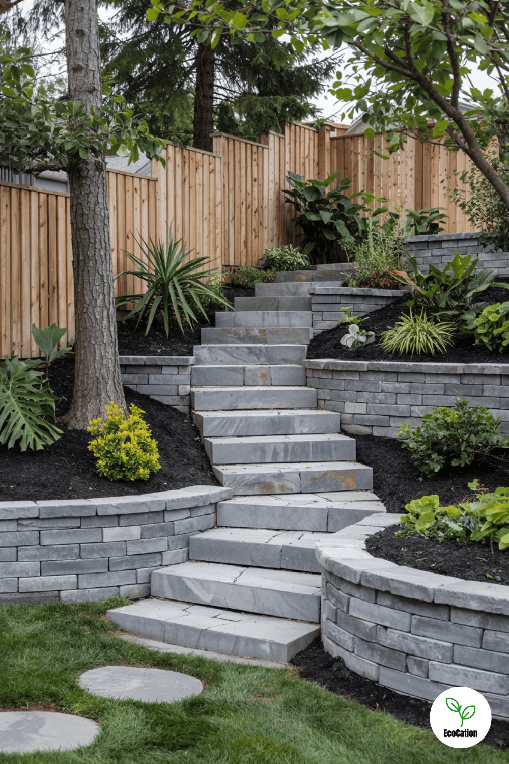 Transform a steep slope into usable space with terraced retaining walls connected by wide stone steps. Each level can host a different garden theme herbs, flowers, or even a mini vegetable patch.