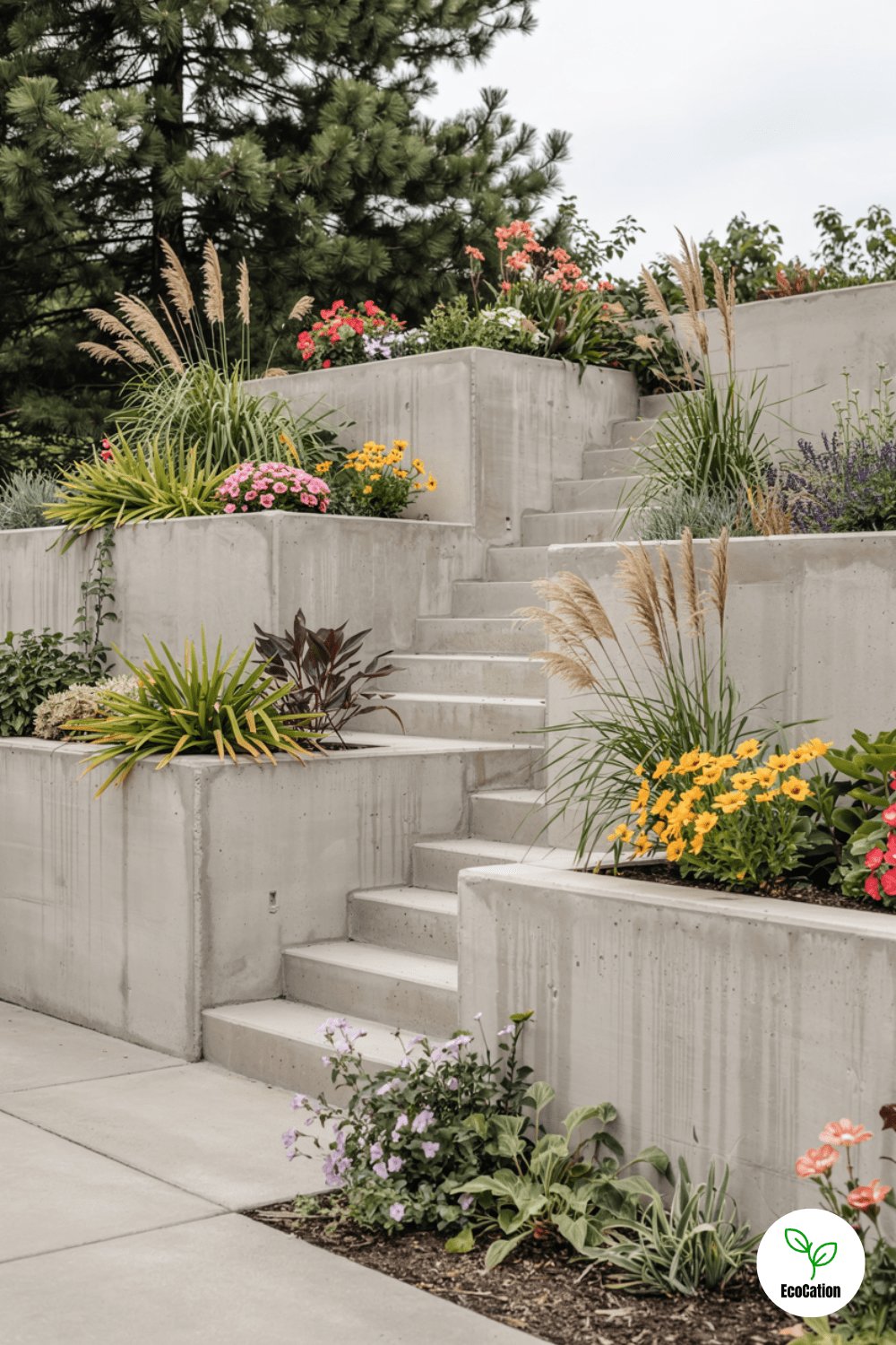 Turn a steep slope into a floral masterpiece with tiered concrete walls featuring built-in planters. Mix ornamental grasses and perennials for year-round color. Bonus: The planters help with soil retention while reducing the wall s bulkiness.