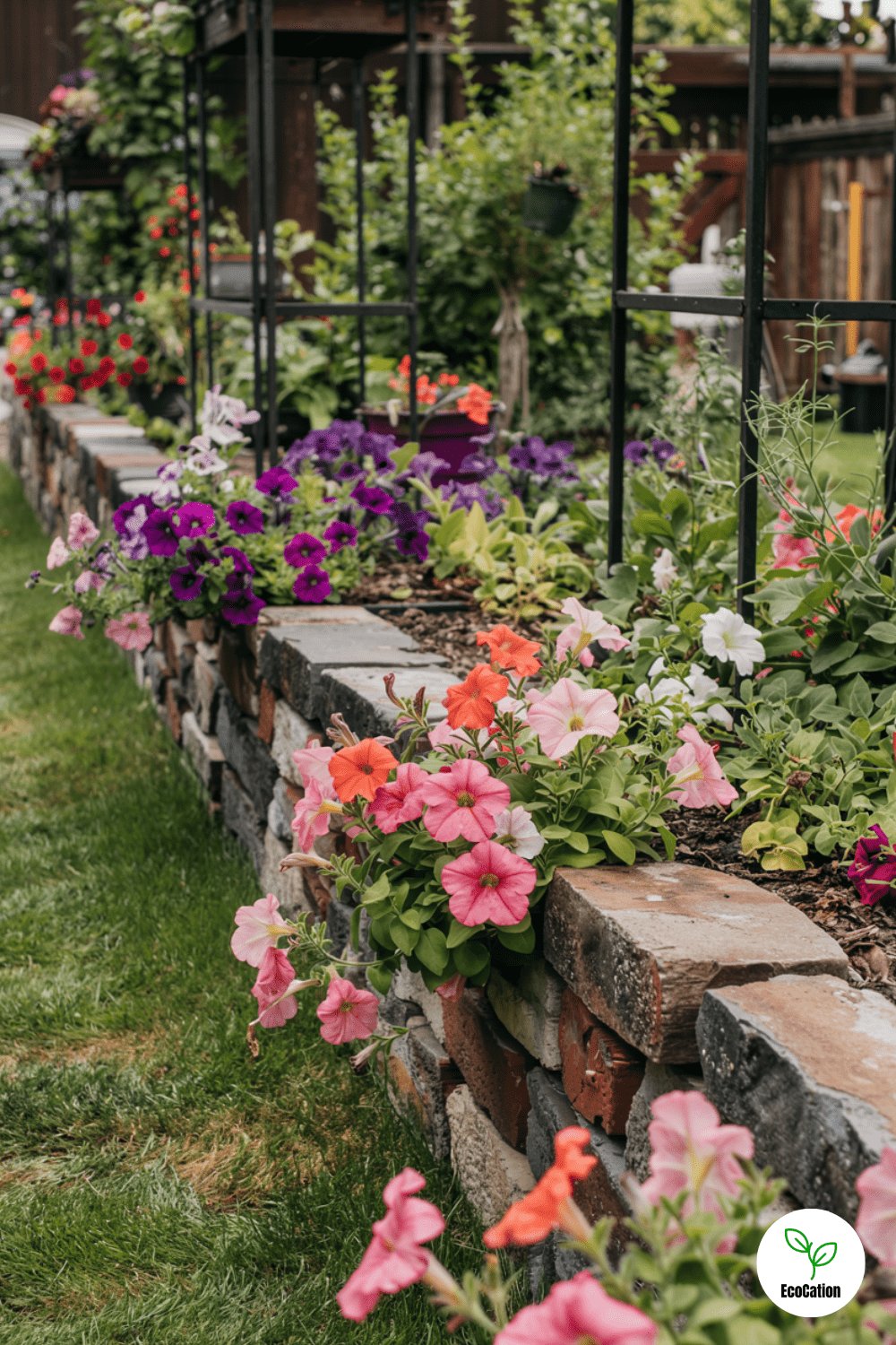 Softening a retaining wall is easy with cascading petunias or trailing lobelia. Opt for heat-tolerant varieties in sunny spots, and water regularly to keep blooms lush.