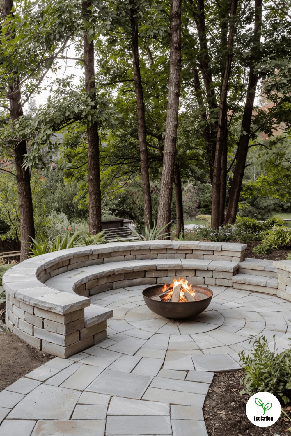 A curved stone wall around a fire pit doubles as seating and wind protection. Choose heat-resistant stones like granite, and leave gaps for ventilation.