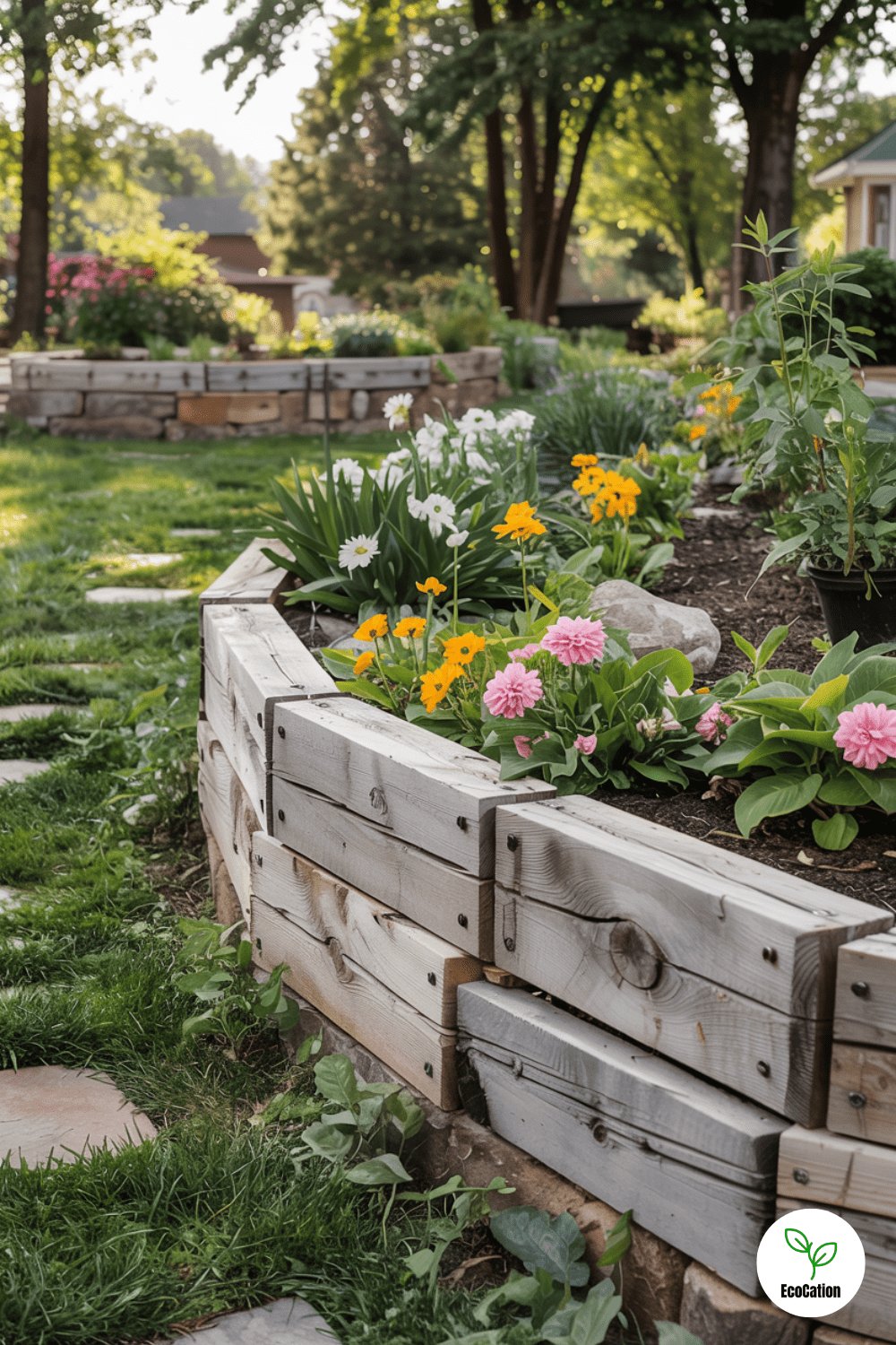Timber retaining walls bring cozy cabin vibes to small gardens. Use pressure-treated wood to resist rot, and stain it for extra protection. Perfect for framing raised flower beds or defining patio edges.