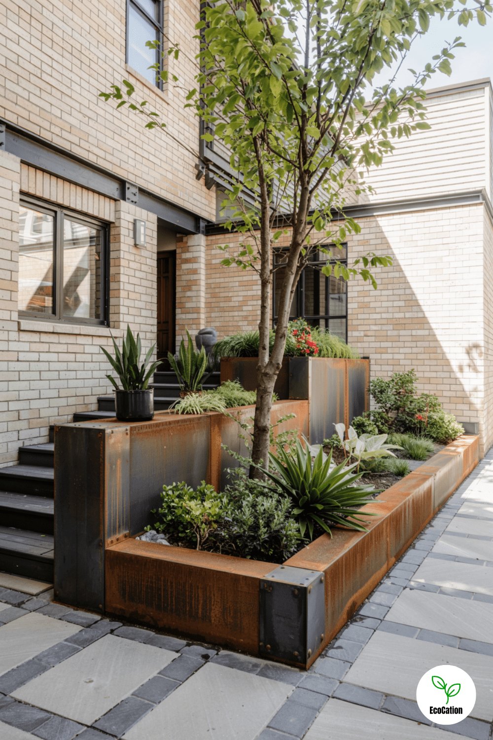 Cor-ten steel panels paired with dark wood create an edgy, modern look. The steel develops a protective rust patina over time, requiring zero maintenance.