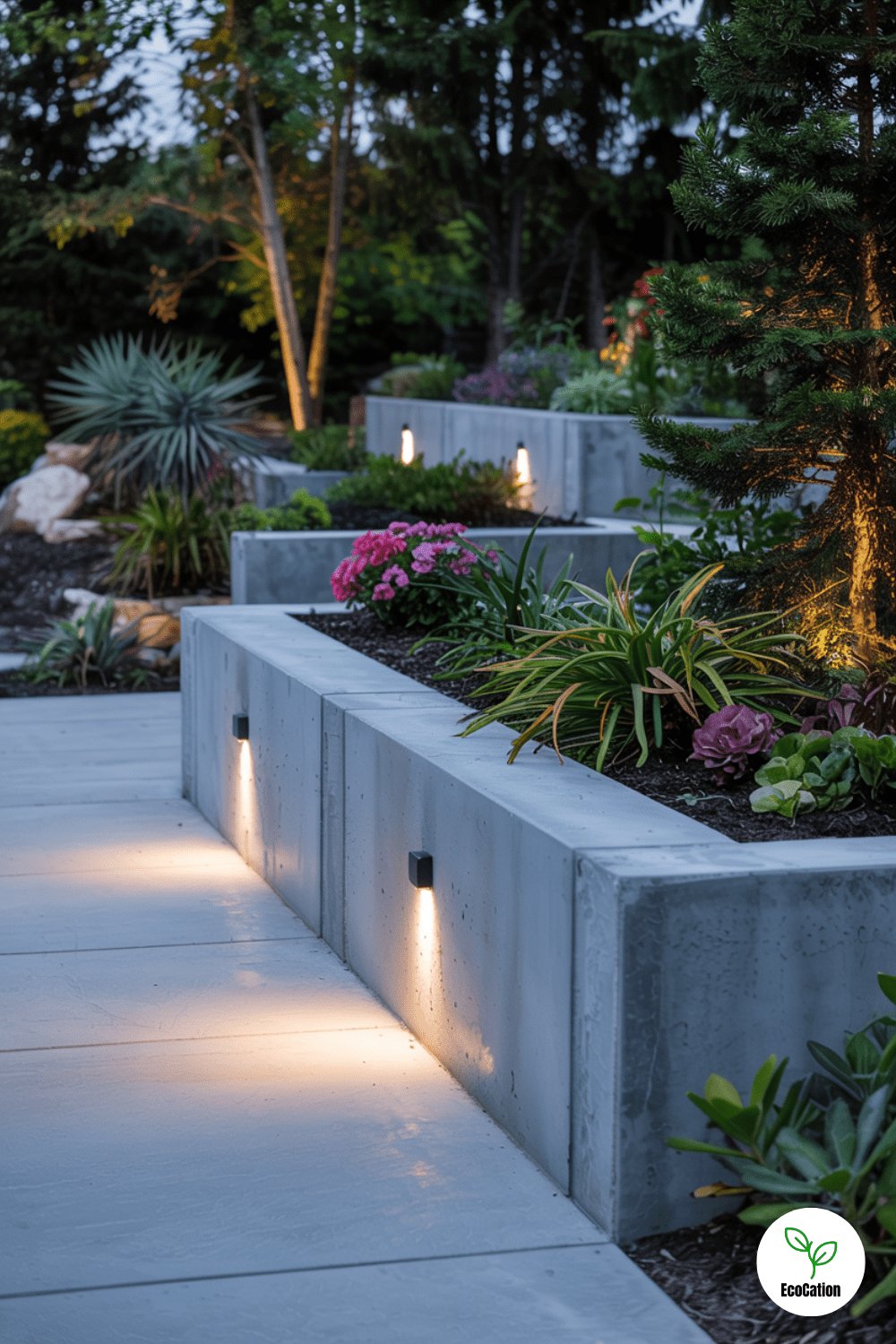 A sleek concrete retaining wall with embedded LED strip lights adds drama and functionality. Perfect for evening ambiance, the soft glow highlights garden pathways while reinforcing the slope. Opt for weather-resistant LEDs and subtle warm tones to create a cozy atmosphere. Pair with drought-tolerant plants for low-maintenance charm.