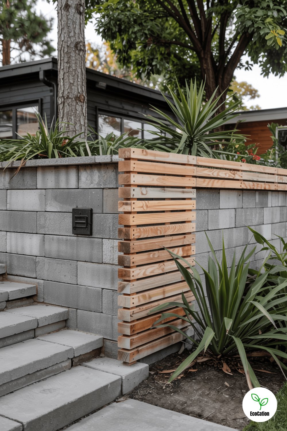 Contrast rough concrete blocks with smooth horizontal wood slats for a contemporary look. The wood warms up the industrial feel, while the concrete ensures longevity. Seal the wood to prevent weathering.