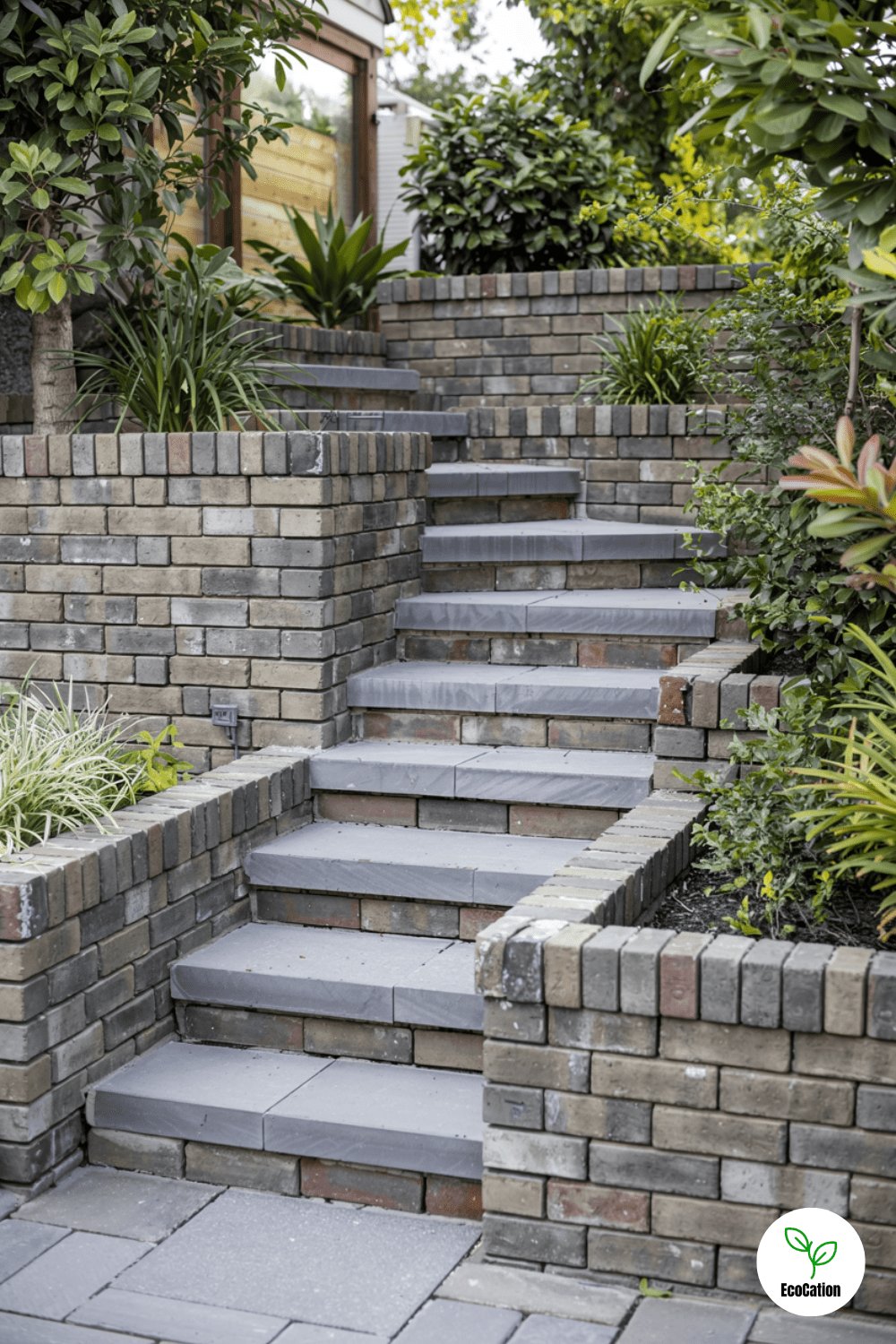 A brick wall with integrated stairs ensures safe, stylish access between garden levels. Match the bricks to your home s exterior for cohesion.