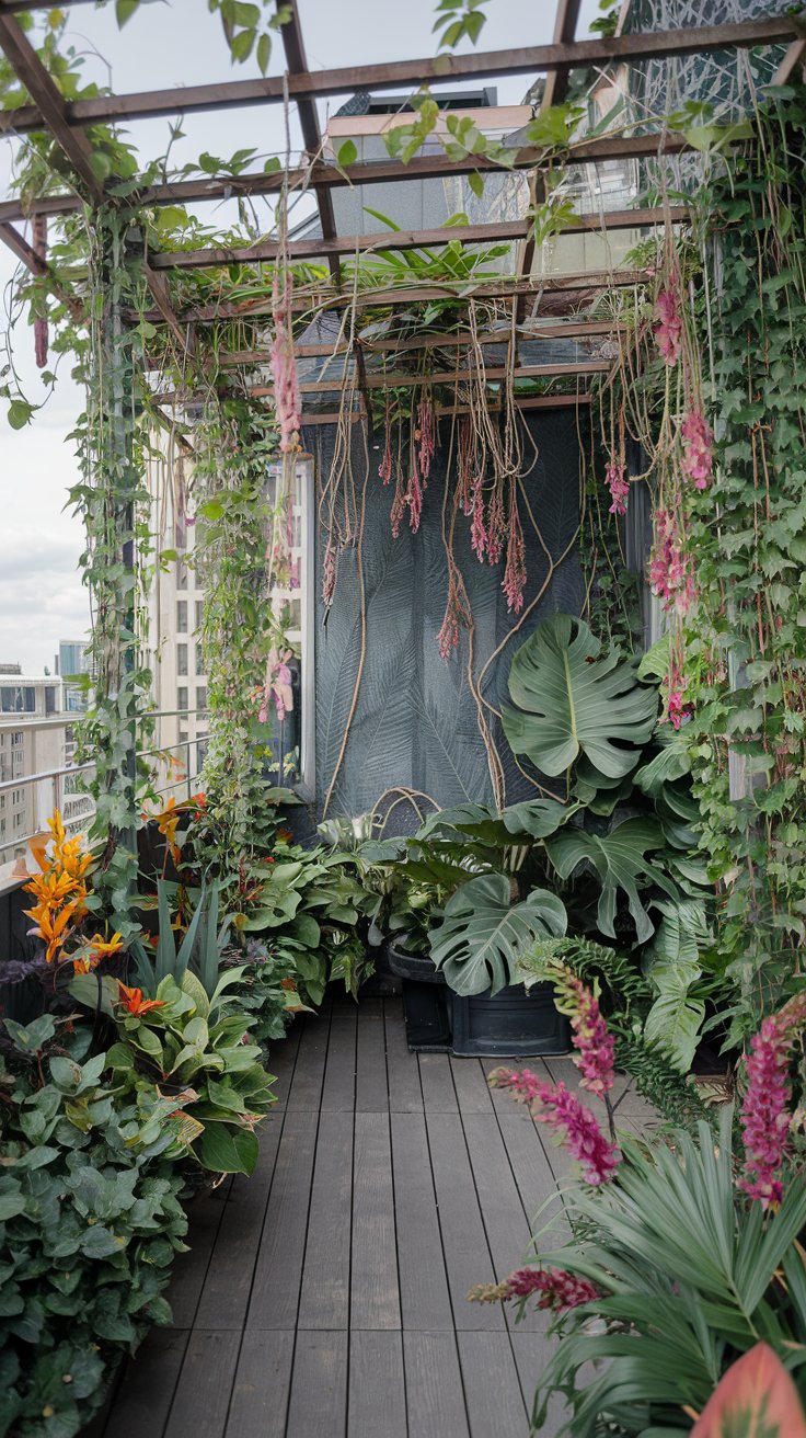 Transform your rooftop into a dense urban jungle with tropical plants, hanging vines, and vibrant flowers. Choose greenery like monstera, palms, and philodendrons to create a lush, wild vibe that brings nature to the heart of the city.