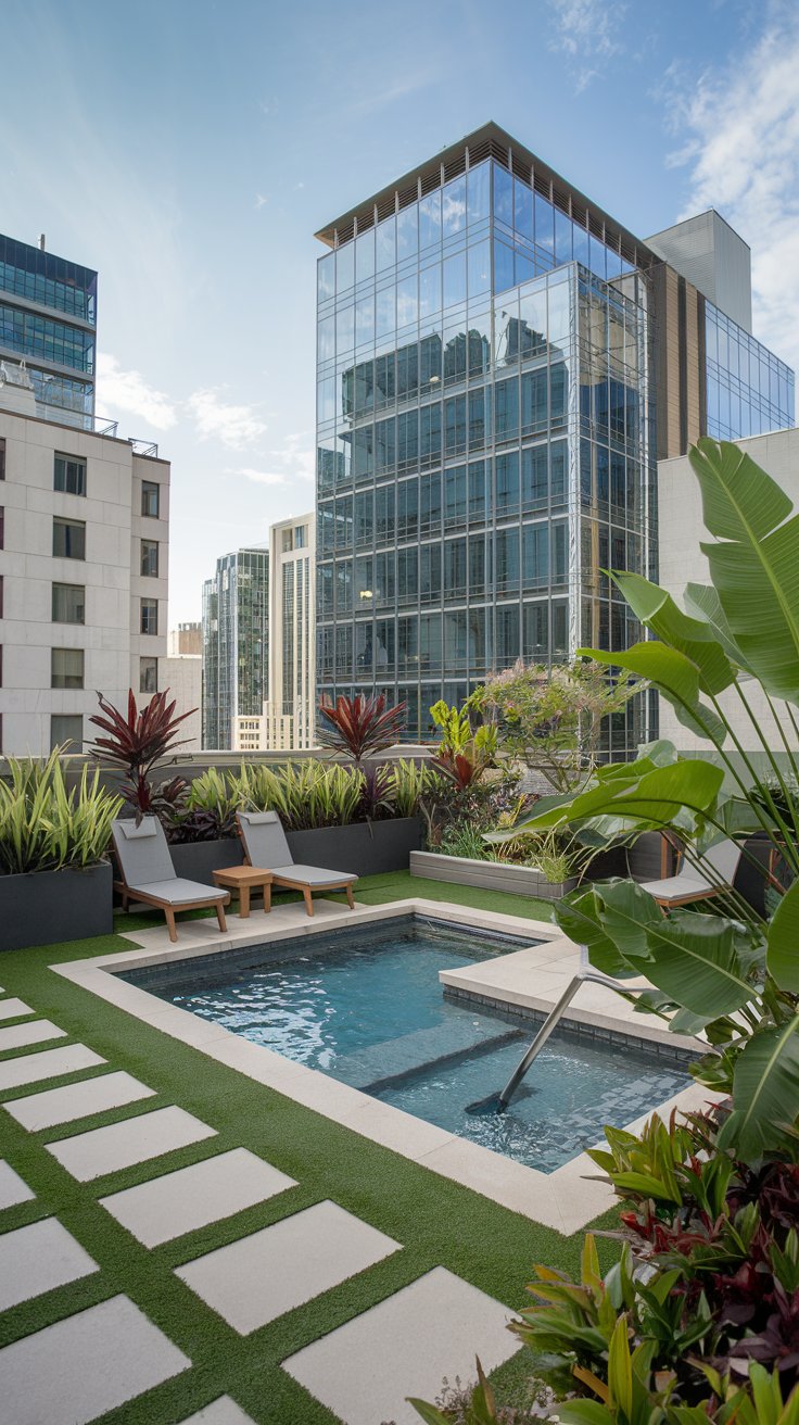 Bring luxury to your rooftop garden with a small pool surrounded by tropical plants and stylish lounge chairs. Palms, ferns, and banana trees thrive in urban environments and provide the ultimate escape. Enjoy the poolside experience with stunning city views.