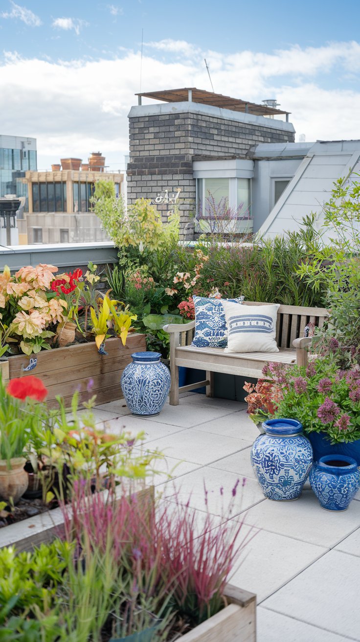 Brighten up your rooftop with a mix of colorful vegetation in decorative pots. A cozy wooden bench surrounded by vibrant flowers like geraniums and marigolds creates a cheerful spot for relaxation and conversation.