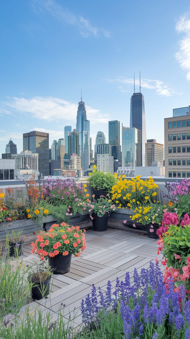 Create a vibrant rooftop garden filled with colorful flowers and lush potted plants, all set against the backdrop of the urban skyline. Choose low-maintenance blooms like marigolds, geraniums, and petunias to add bursts of color. Pair this with comfortable seating to enjoy the stunning views while surrounded by nature.