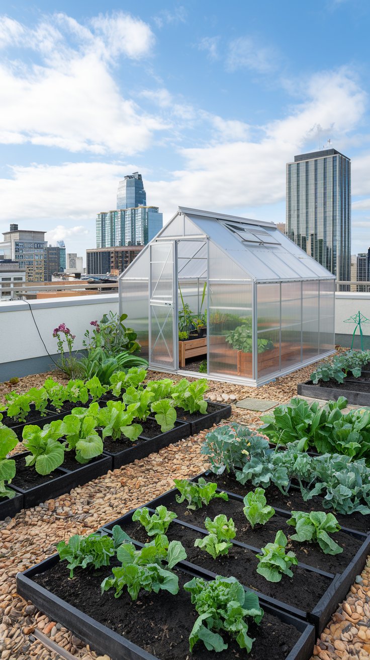 Take your rooftop garden to the next level with a small greenhouse. Perfect for year-round vegetable gardening, it allows you to grow everything from herbs to leafy greens regardless of the weather. Pair the greenhouse with raised garden beds for a productive and sustainable setup.