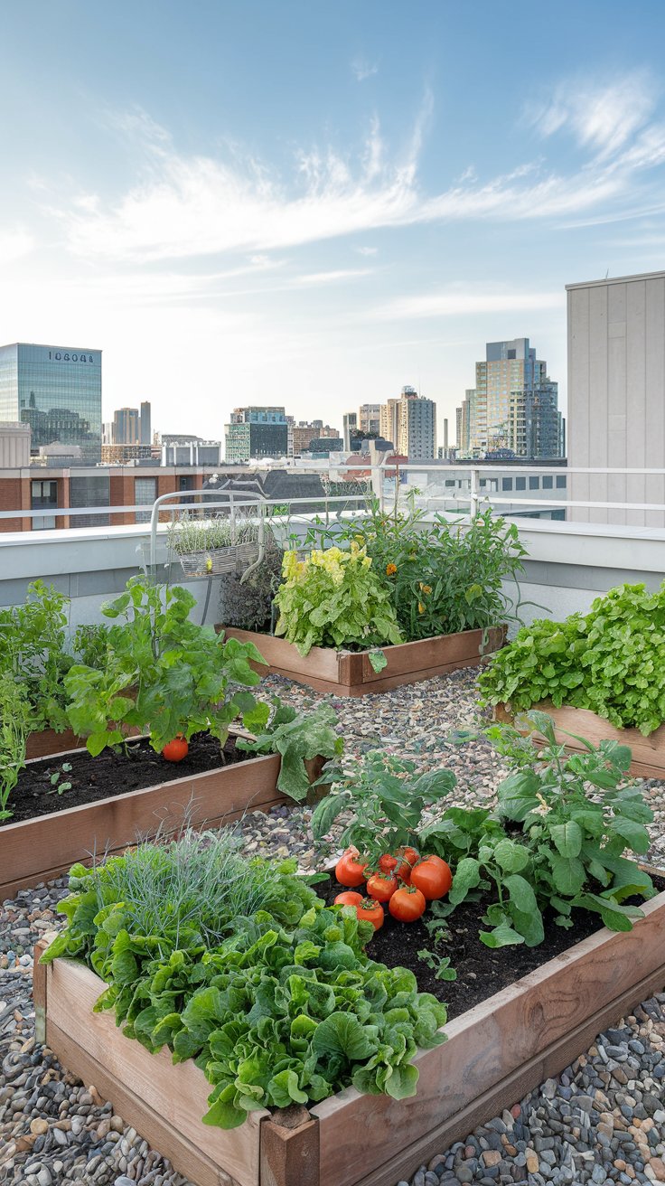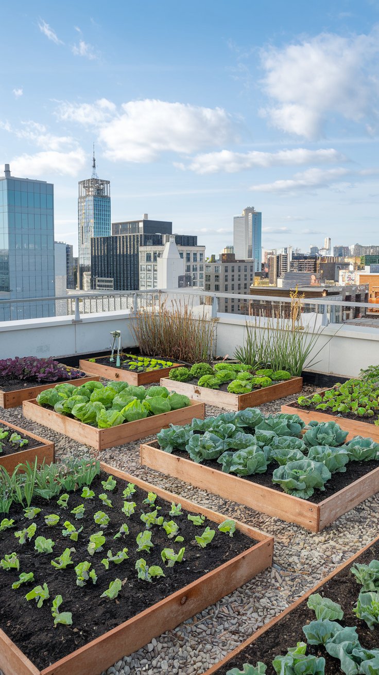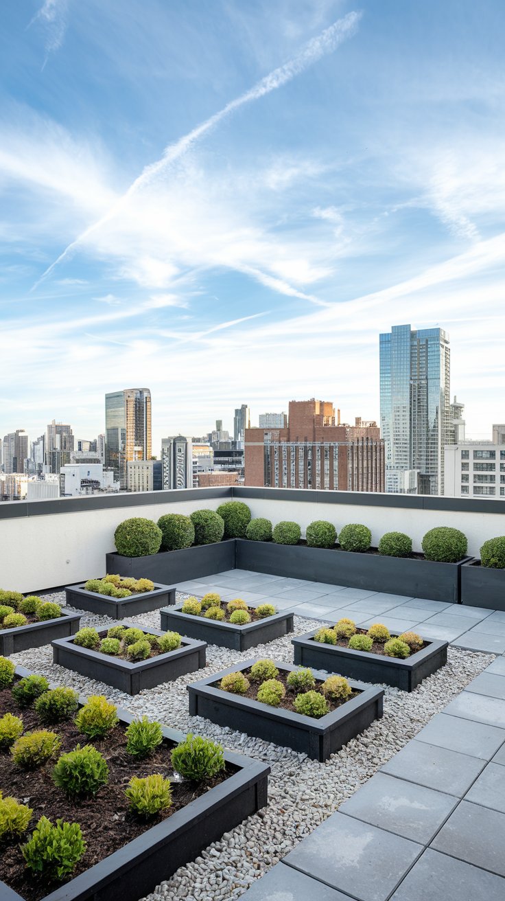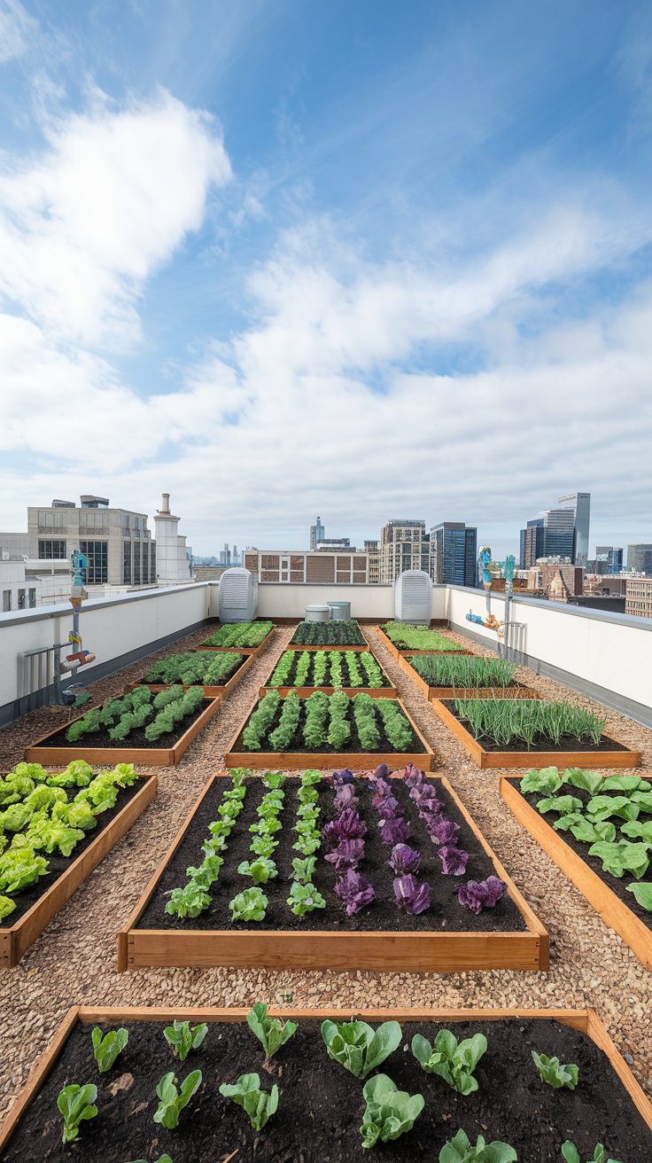 Create a well-organized rooftop vegetable garden with neatly aligned raised planting boxes. Add drip irrigation for efficient watering and grow a variety of seasonal crops. From peppers to lettuce, this setup turns your roof into a food-producing paradise.