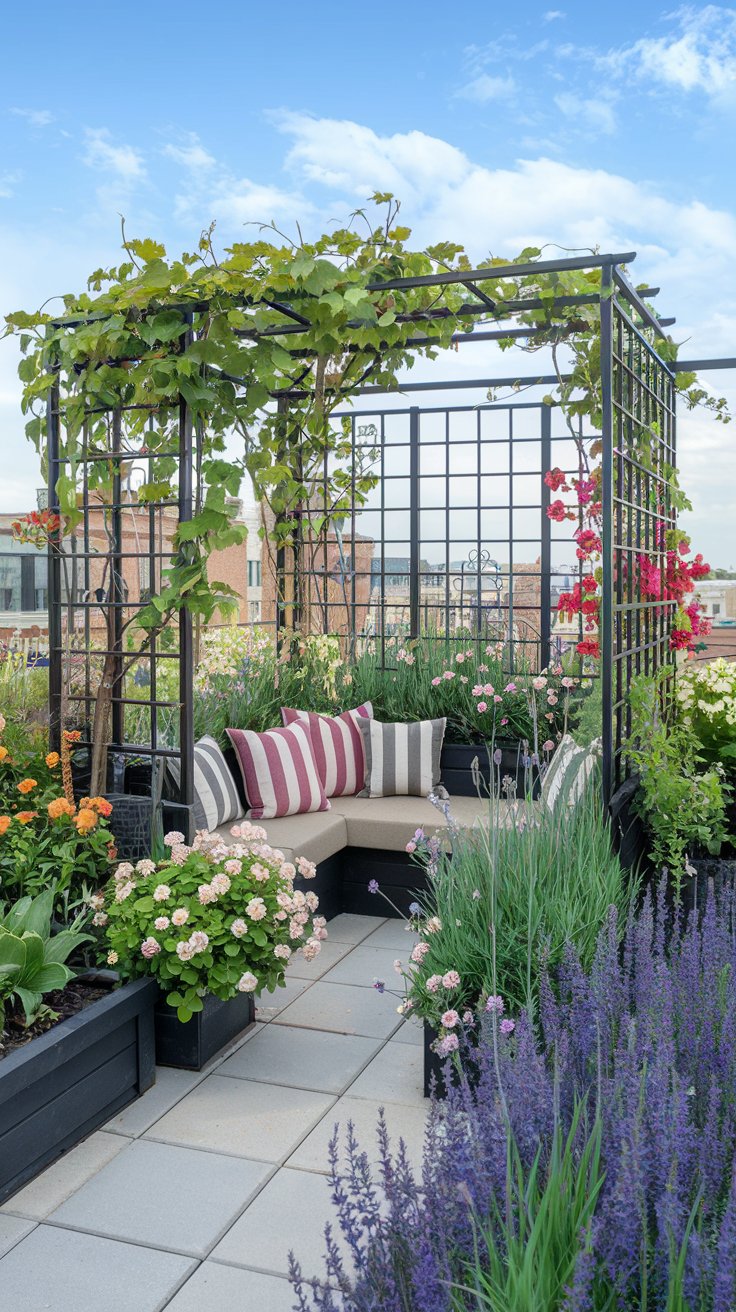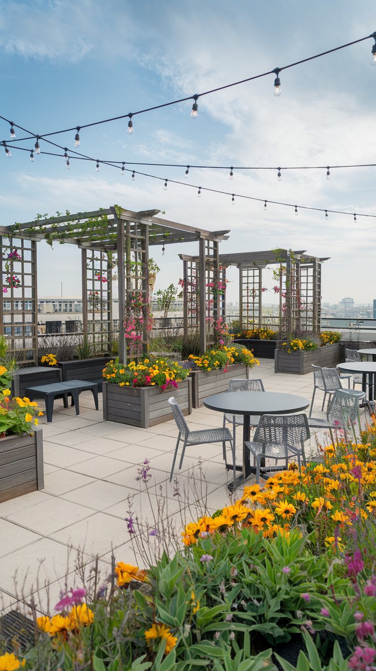 A spacious rooftop can become a social hub with trellises adorned with colorful flowers and multiple seating areas. Arrange benches, chairs, and tables to accommodate gatherings while surrounded by lush greenery and blooms.