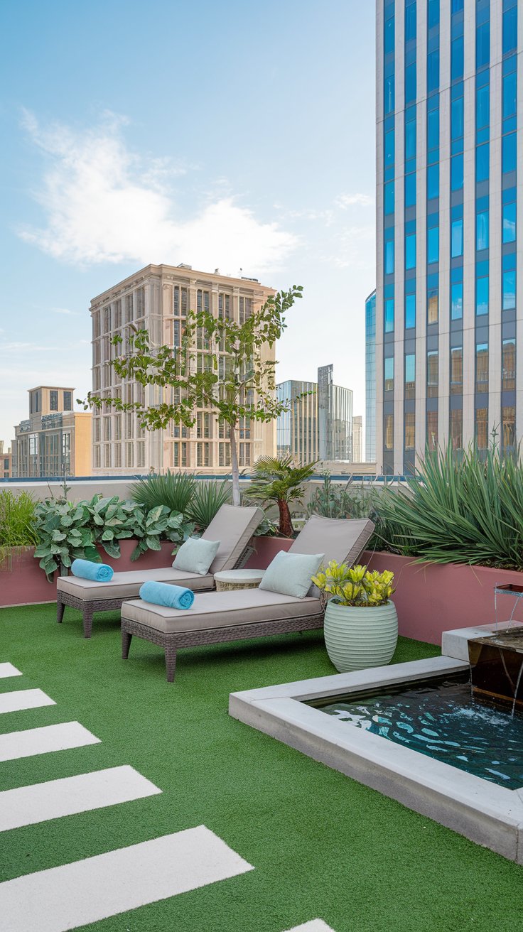 Create a tranquil retreat on your rooftop with comfortable lounge chairs and a small water fountain. The sound of trickling water paired with leafy potted plants promotes relaxation and calm. This serene setup is perfect for unwinding after a long day or soaking up some sun.