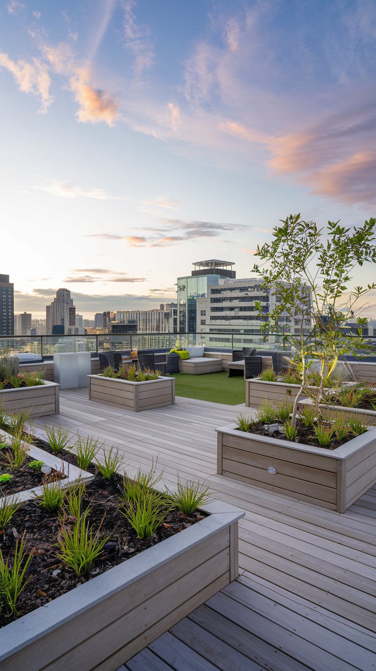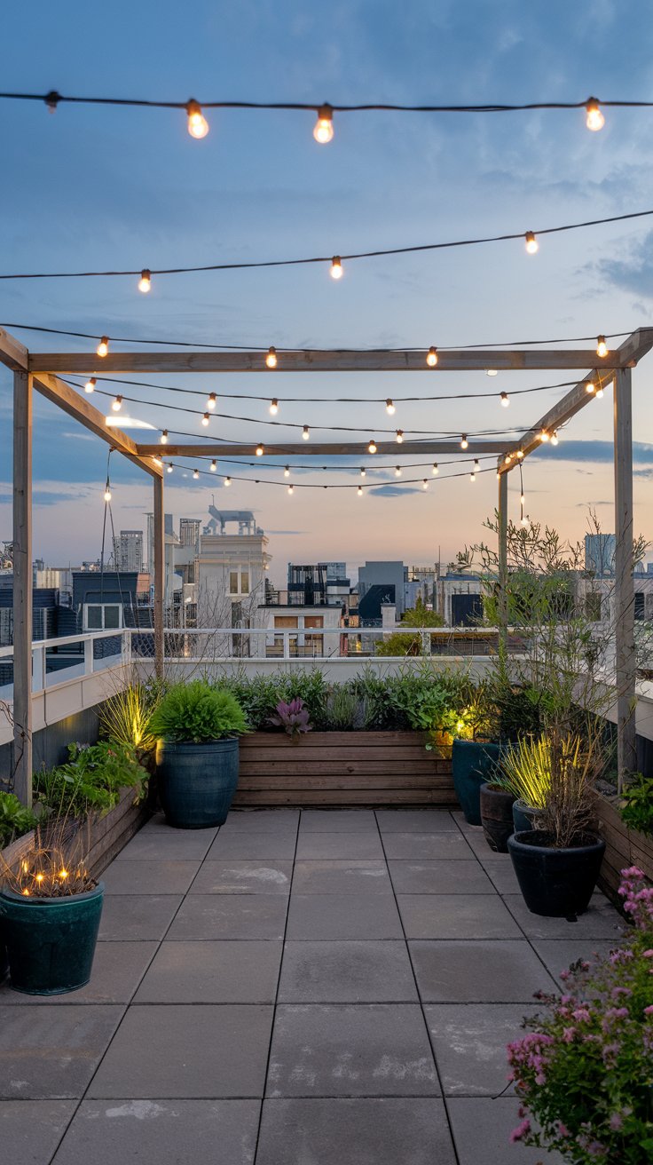A sleek wooden deck paired with decorative lighting sets the stage for an unforgettable rooftop garden. Arrange planters neatly along the perimeter to define the space and create a polished look. Modern LED string lights or lanterns add warmth and charm, making this rooftop design ideal for evening gatherings or quiet nights under the stars.