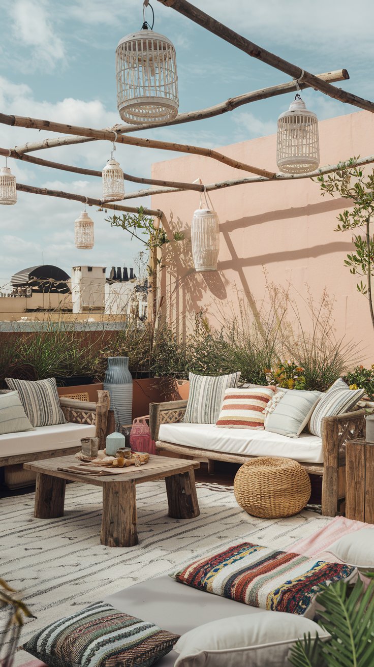 Go for a bohemian-inspired rooftop garden with cozy cushions, rustic wooden furniture, and hanging lanterns. Mix and match colorful textiles for a relaxed vibe. Potted succulents, cacti, and flowering plants complete this laid-back and stylish look.