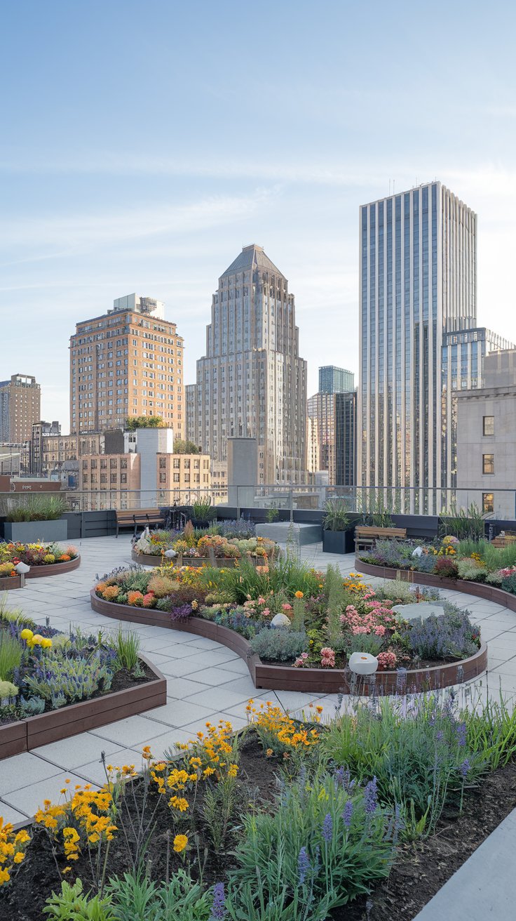 Introduce winding pathways and vibrant flower beds for a charming urban rooftop garden. Use pavers or gravel to create paths that meander through colorful blooms like daisies, lavender, and roses. Add benches to offer the perfect spot to admire the city views.