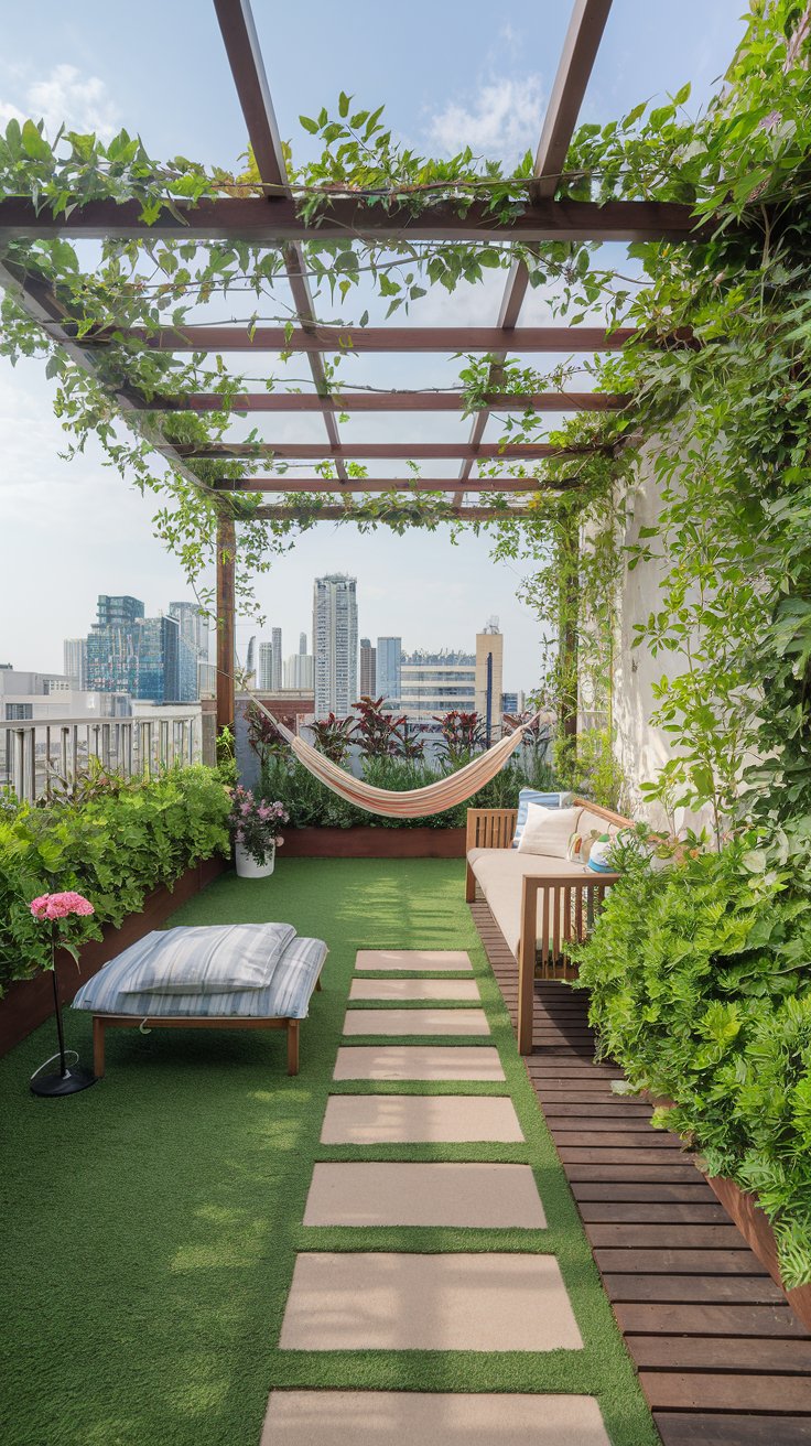 Turn your rooftop garden into a peaceful outdoor retreat with lush greenery, wooden floors, and a hammock. It s the perfect place to relax with a book or enjoy a lazy afternoon surrounded by the soothing sounds of nature.