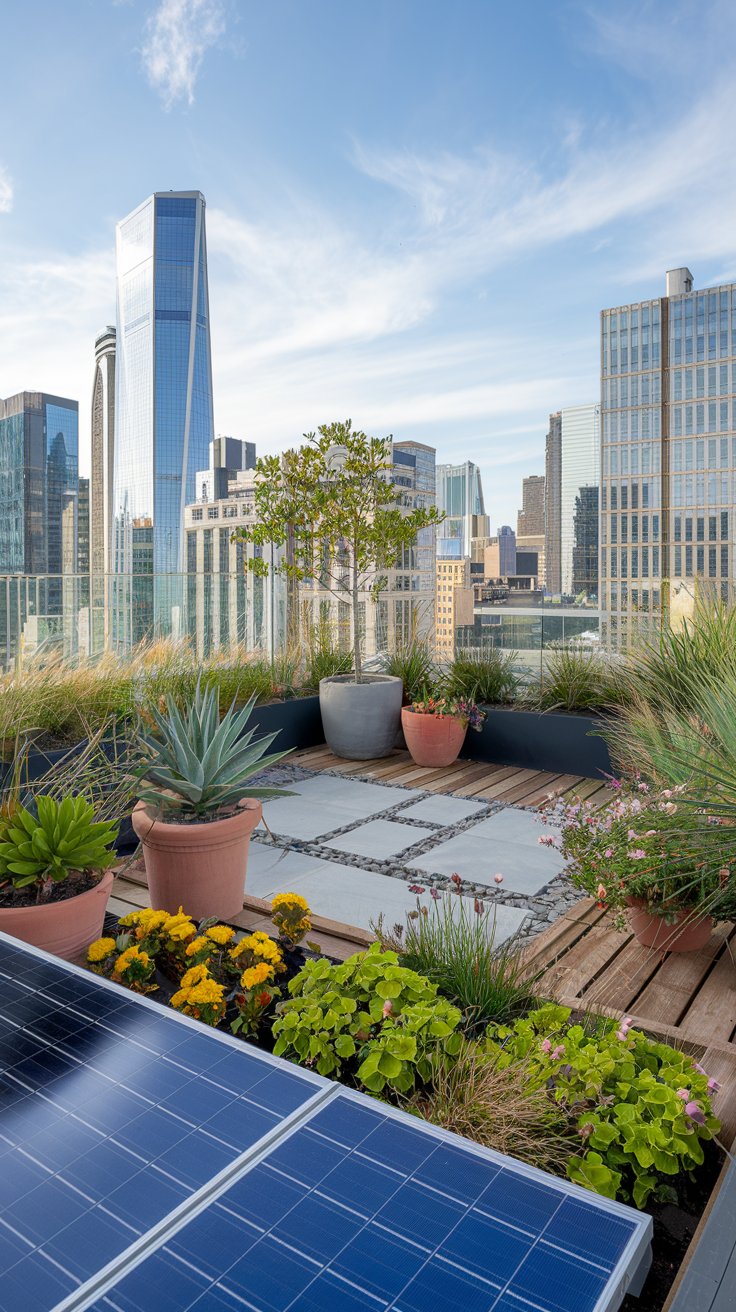 Combine sustainability and greenery with an eco-friendly rooftop garden featuring solar panels. Surround the panels with low-maintenance potted plants to optimize space and energy efficiency. It s a practical, green solution that adds value to your rooftop.